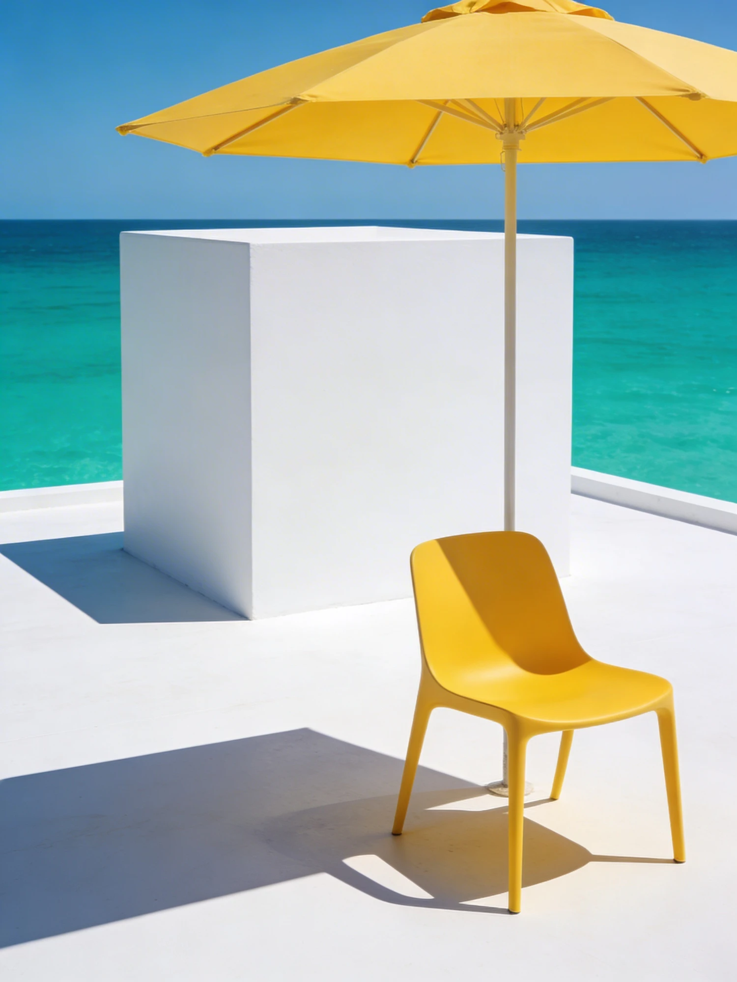 A bright yellow chair and umbrella on a white terrace with a turquoise sea backdrop, creating a vibrant and minimalist outdoor scene.