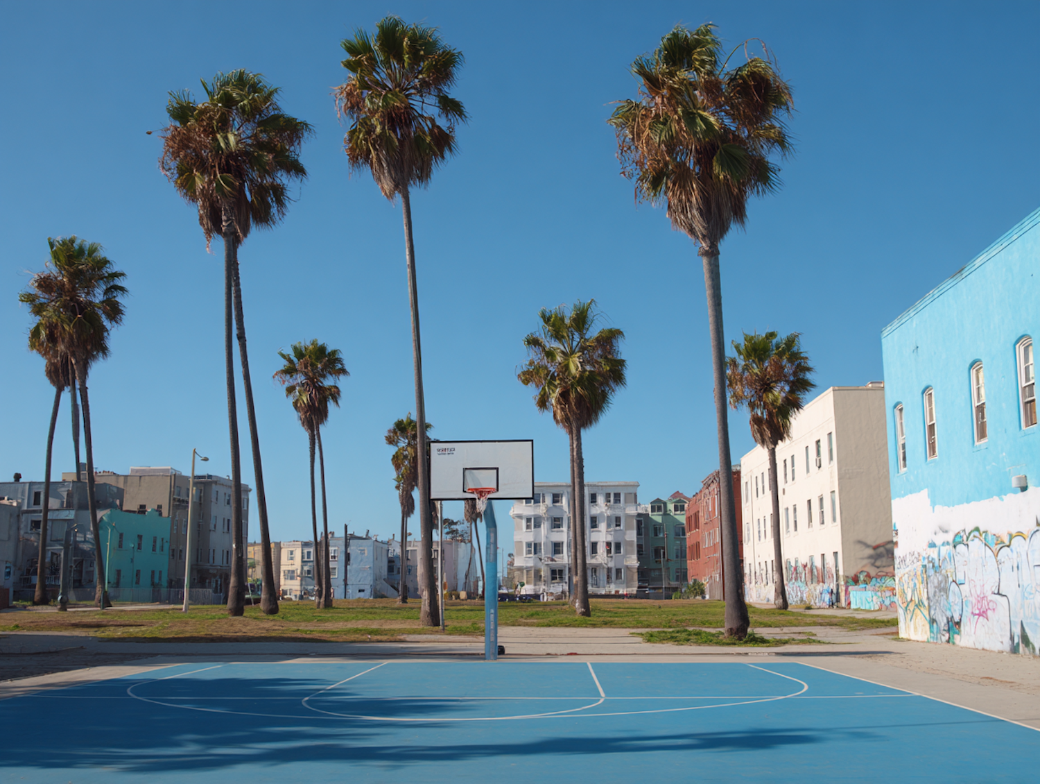 A bright blue basketball court surrounded by tall palm trees and colorful buildings on a sunny day in an urban setting.