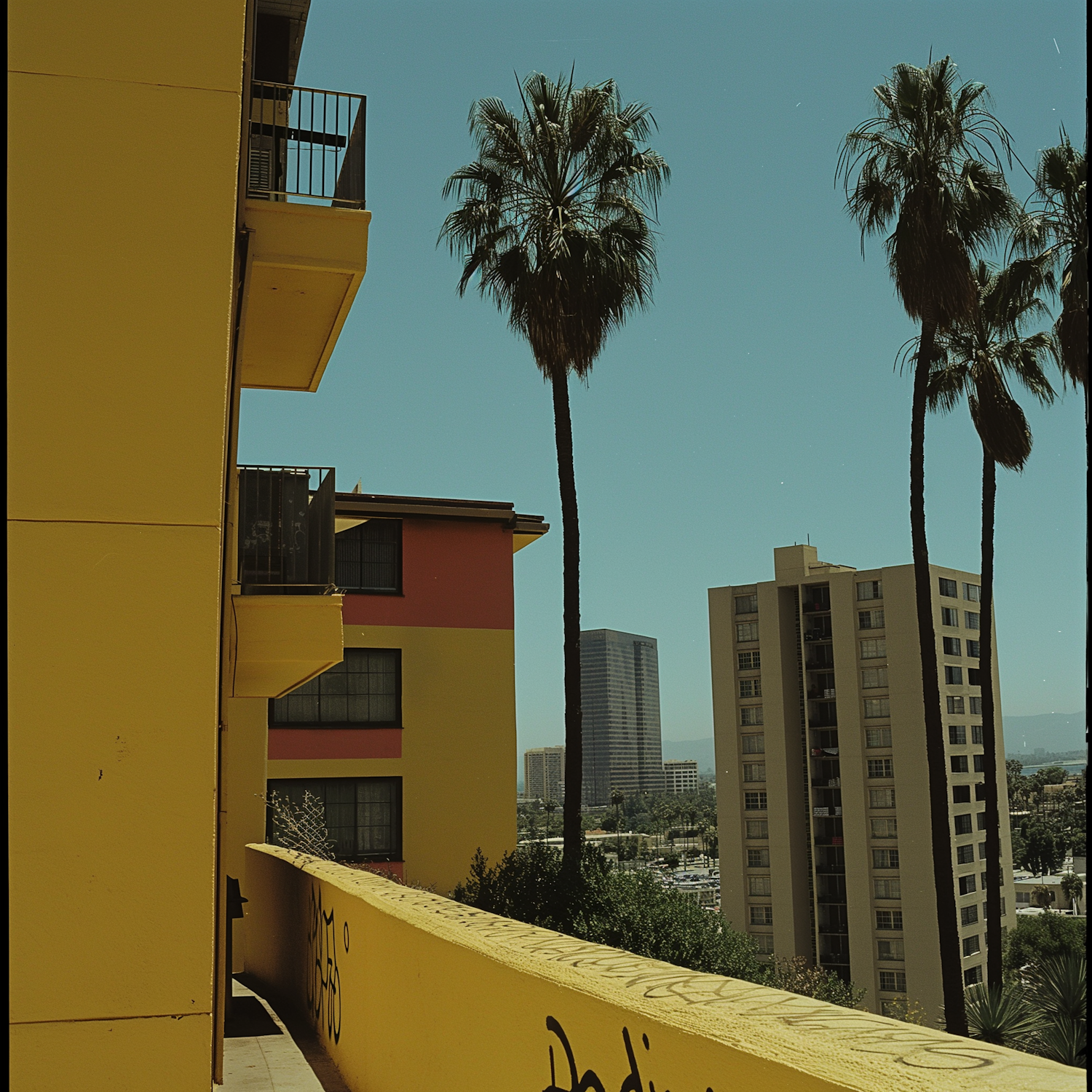Vibrant urban scene with colorful buildings, palm trees, and high-rises under a clear blue sky.