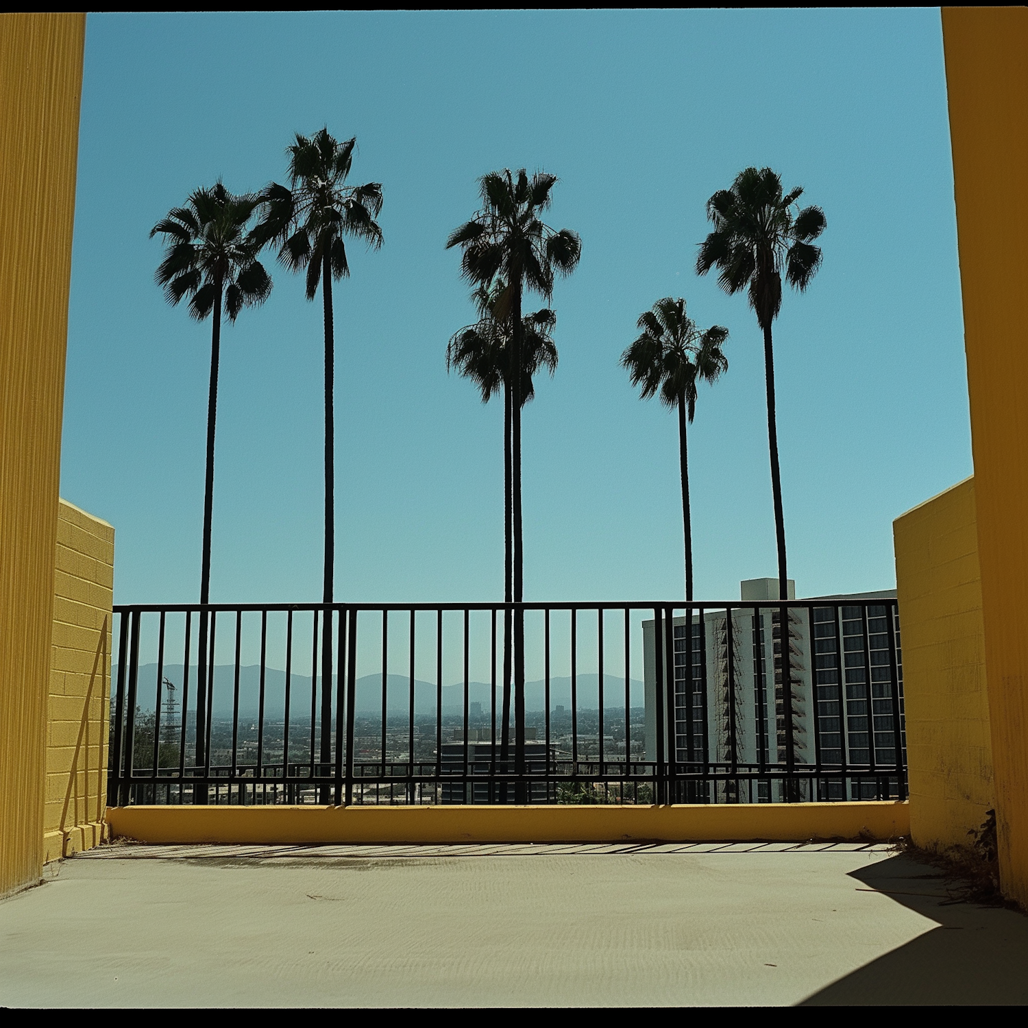 Tall palm trees framed by yellow walls and a black railing, with a cityscape and mountains in the background under a clear blue sky.