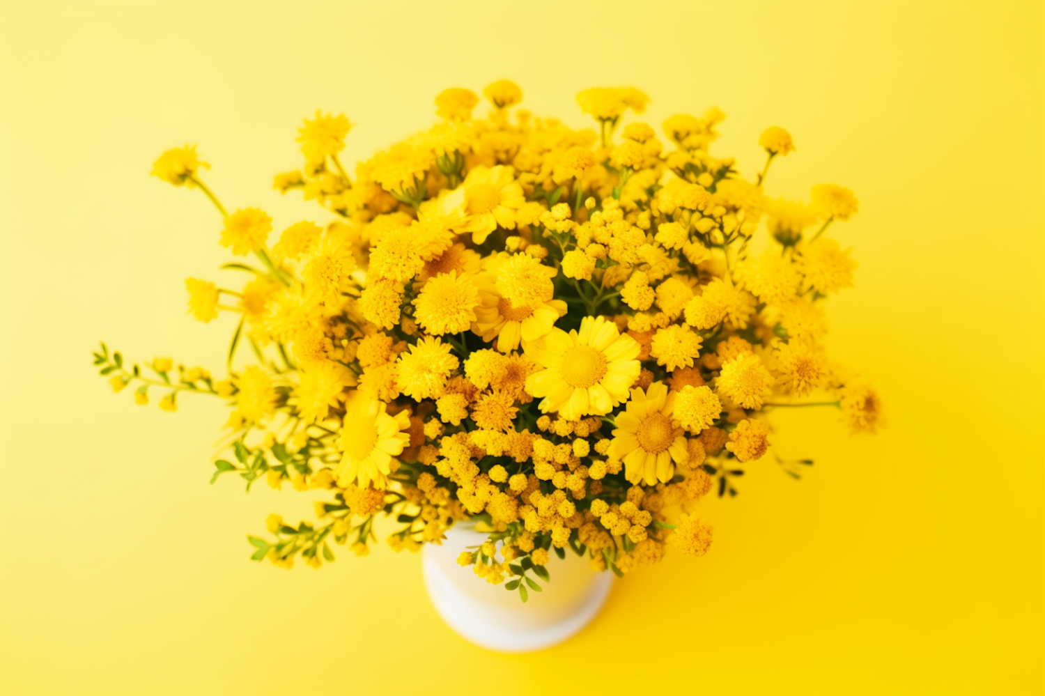 Bright yellow bouquet in a white vase against a yellow background, featuring daisy-like flowers and lush greenery.