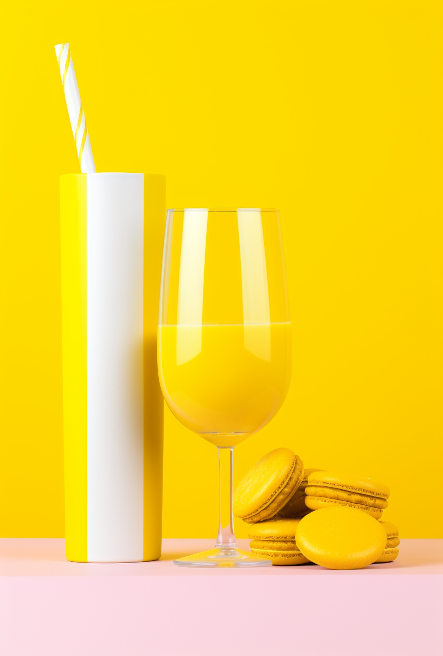 Bright yellow cup, glass, and macarons on a pink surface with a vivid yellow background. Cheerful and vibrant composition.