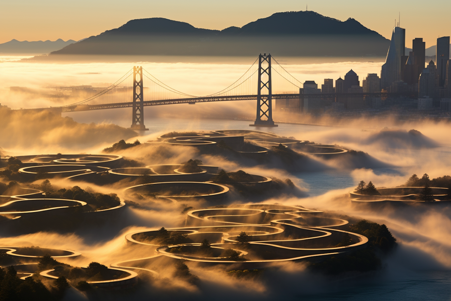 A stunning bridge and city skyline enveloped in fog, with winding roads and golden light creating an ethereal landscape.