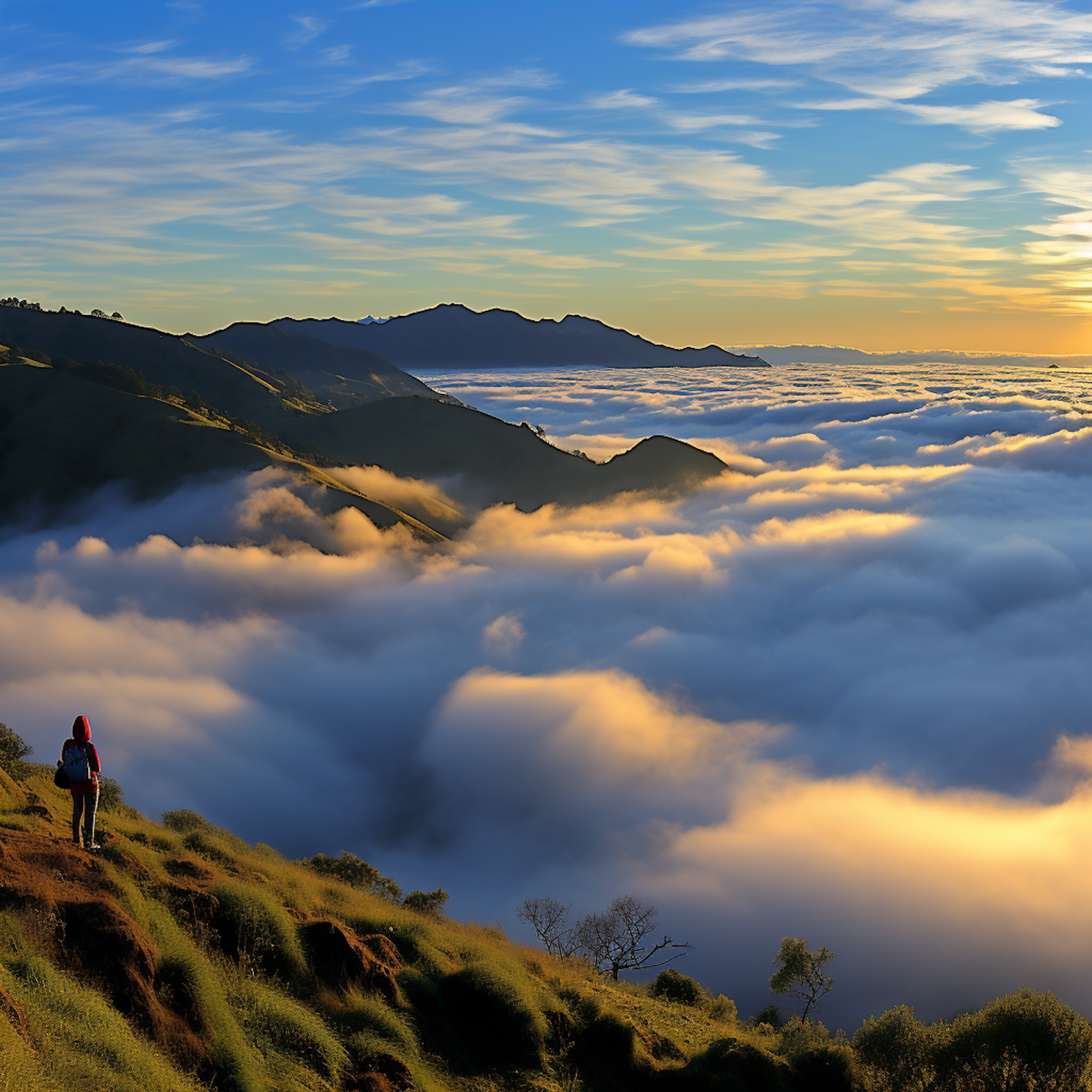 Hiker in red jacket overlooks a sea of clouds at sunset, with rolling hills and vibrant sky in the background.