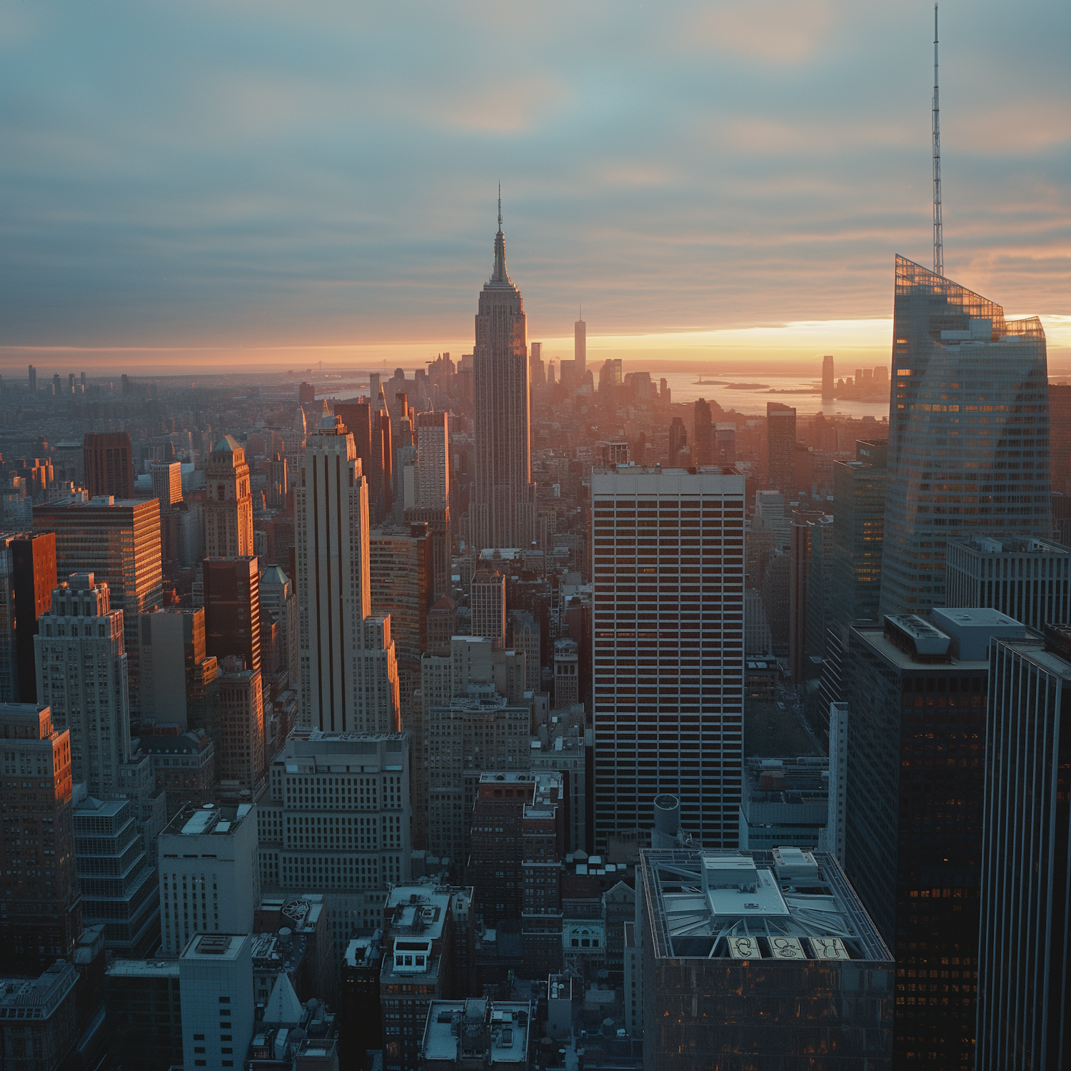 A stunning aerial view of a cityscape at sunset, featuring the Empire State Building and a vibrant skyline bathed in golden light.