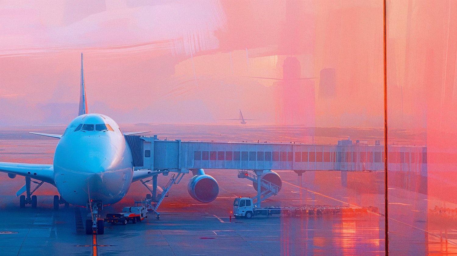 Airplane at airport gate during a vibrant sunrise or sunset, with warm pink and orange hues creating a serene atmosphere.