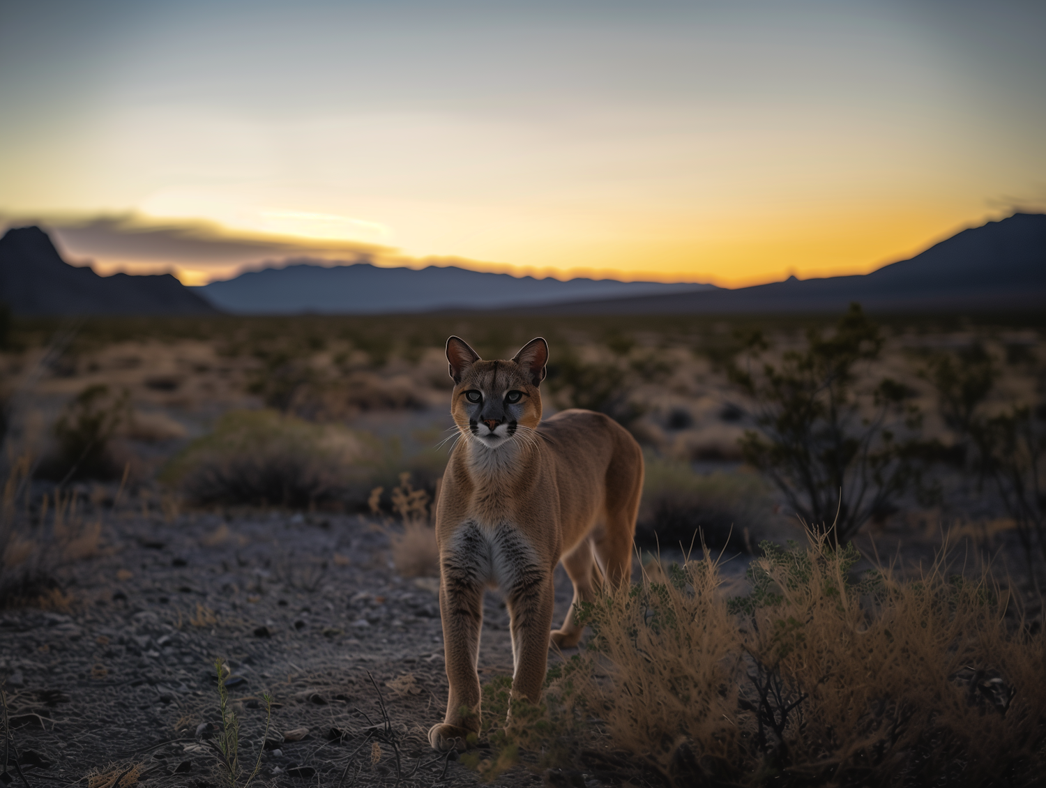 Mountain lion in a desert landscape at sunset, with vibrant sky and distant mountains. Majestic wildlife scene in natural habitat.