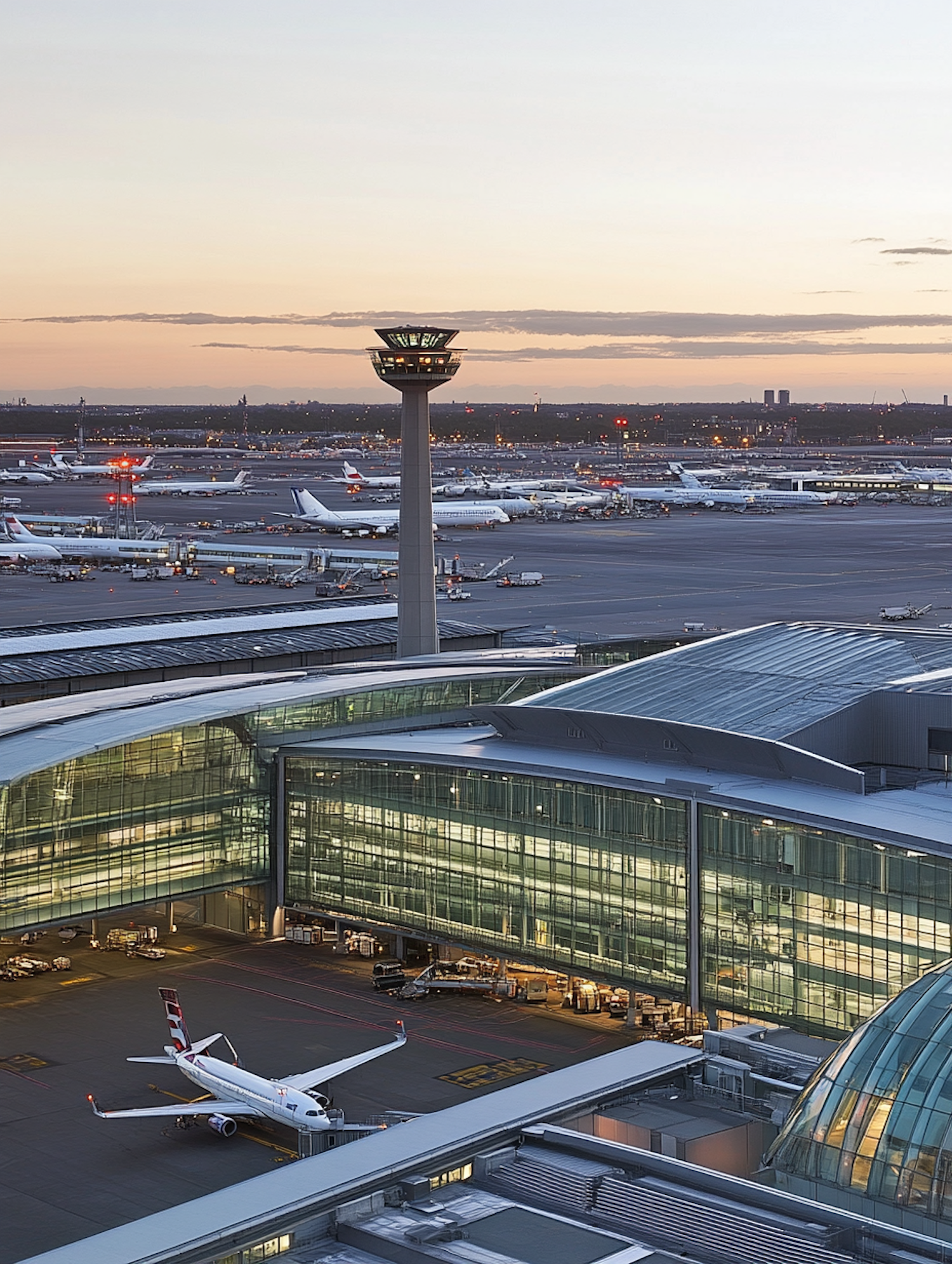 A modern airport terminal at sunset with a control tower, parked planes, and a cityscape in the background under a pastel sky.
