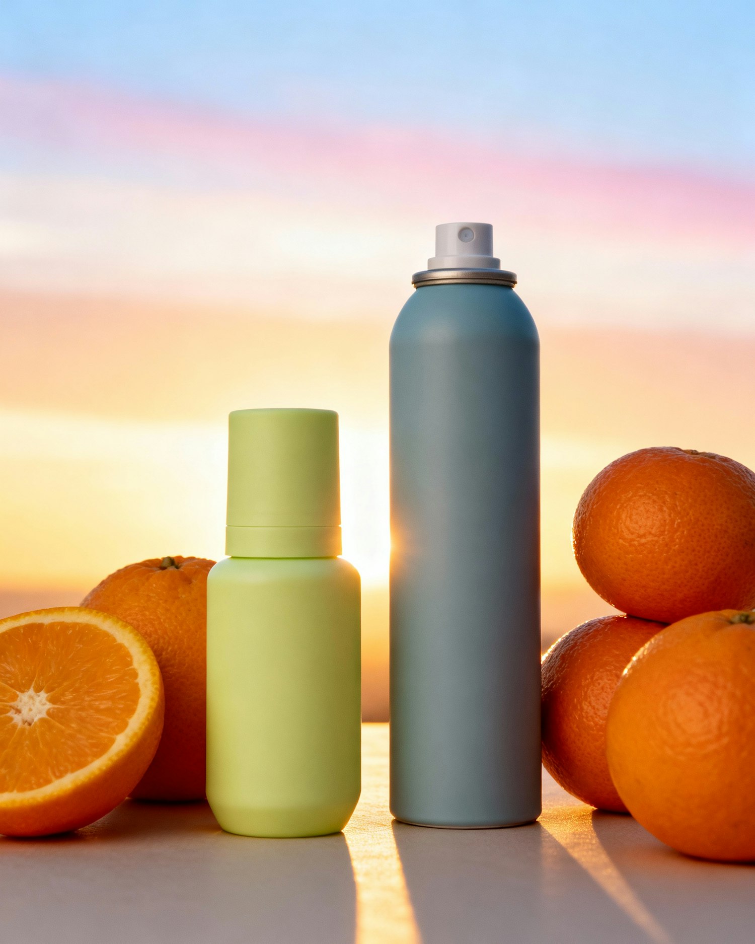 roll-on in vert citron doux + matte aerosol deodorant in gris bleuté. sunrise gradient sky, whole oranges around the duo, warm glowing ambiance.