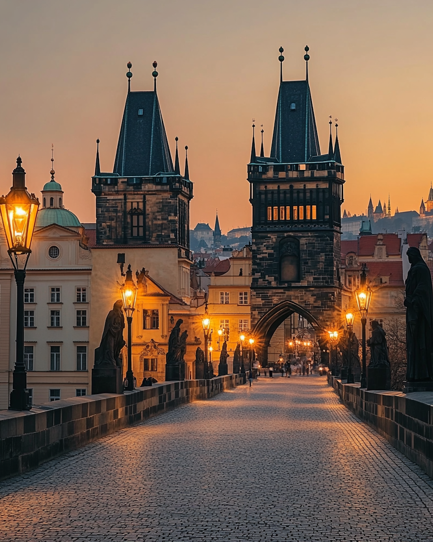 Sunset view of Charles Bridge in Prague with glowing street lamps and Gothic towers, creating a serene and historic atmosphere.