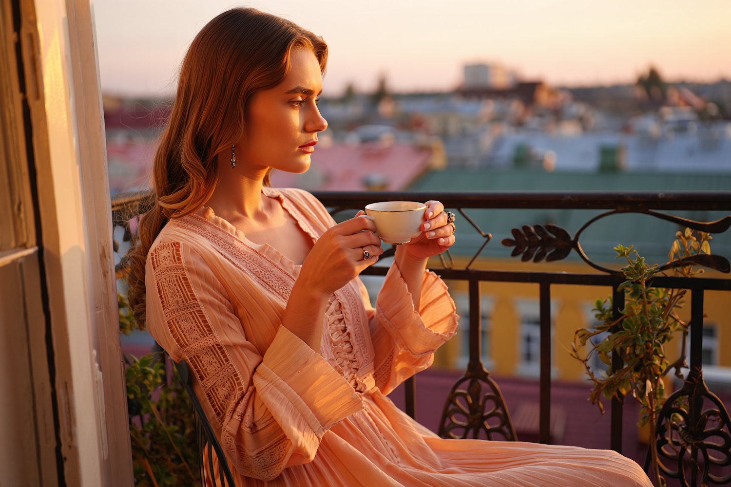 A serene moment of a woman enjoying tea on a balcony at sunset, dressed in a peach lace dress with a cityscape in the background.
