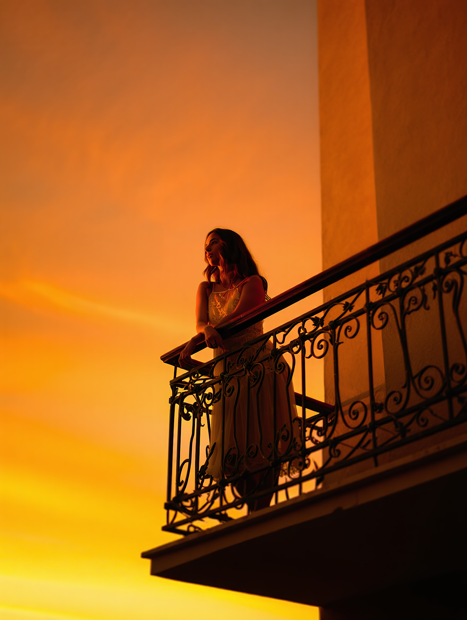 A woman in a flowing dress stands on a balcony against a vibrant orange sunset, leaning on an ornate railing and gazing into the distance.