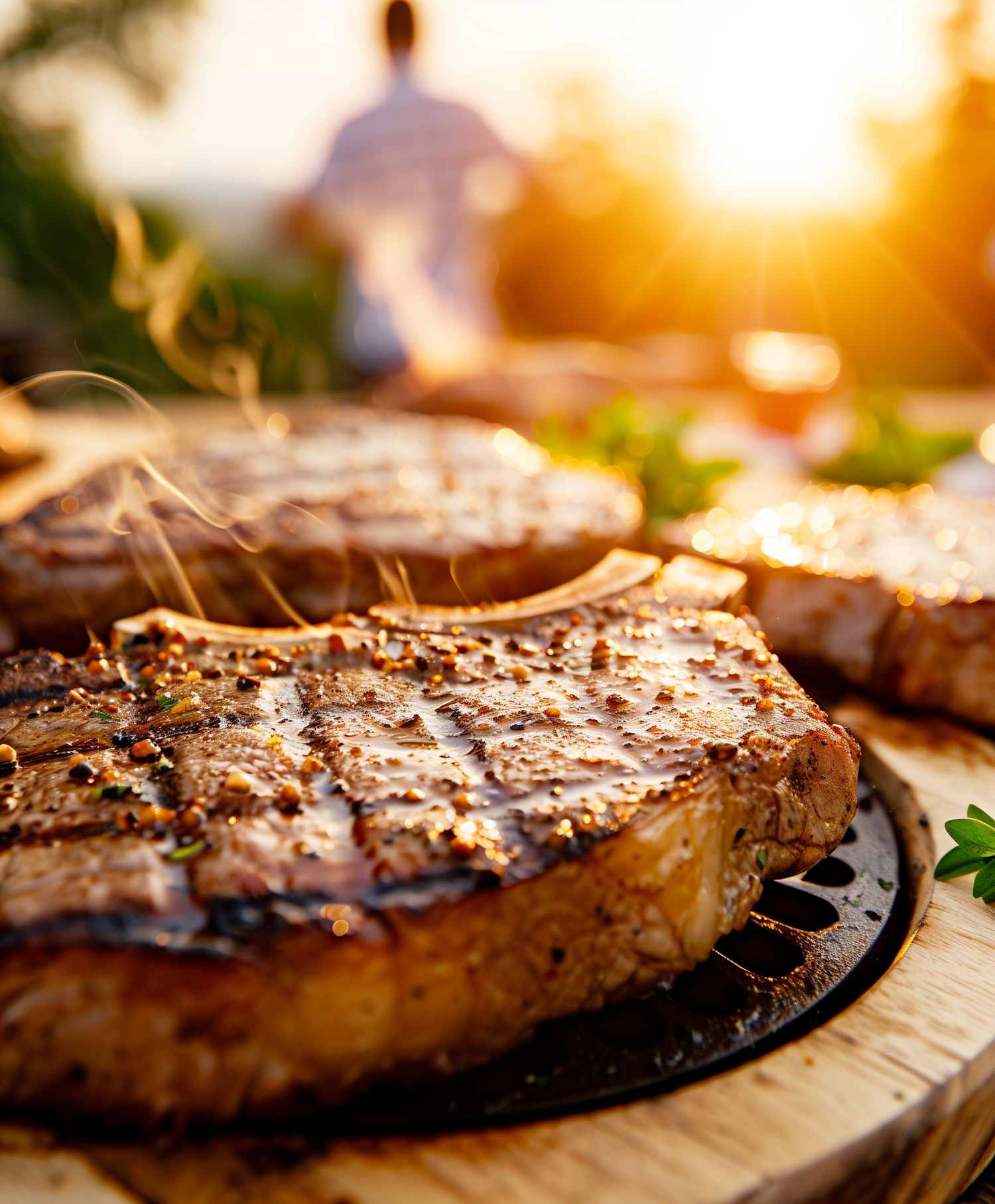 Juicy grilled steaks with spices on a wooden board, steam rising, in a warm sunset glow. Perfect for a summer barbecue vibe.