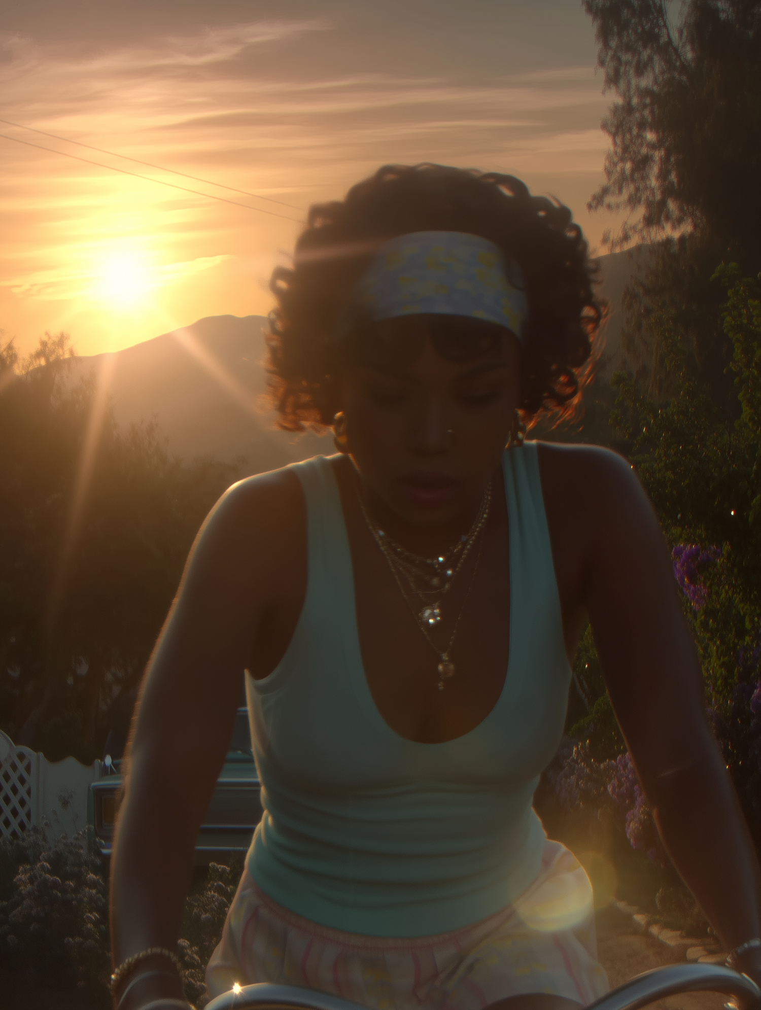 A person rides a bike at sunset, wearing a headband and pastel outfit, with a serene golden glow and mountain backdrop.