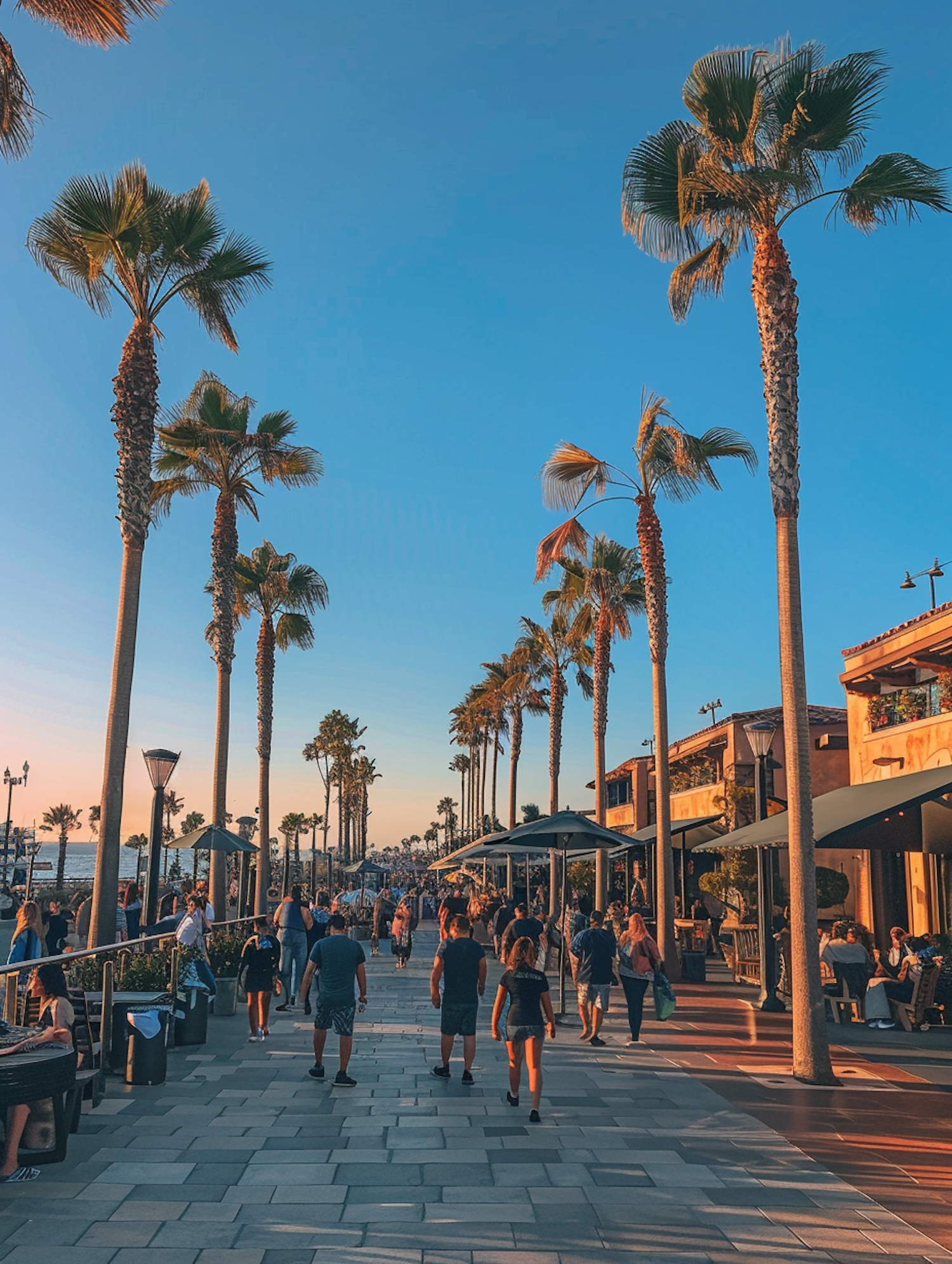 Sunny boardwalk with palm trees, people strolling, and outdoor cafes. Vibrant, lively coastal scene with clear blue skies.