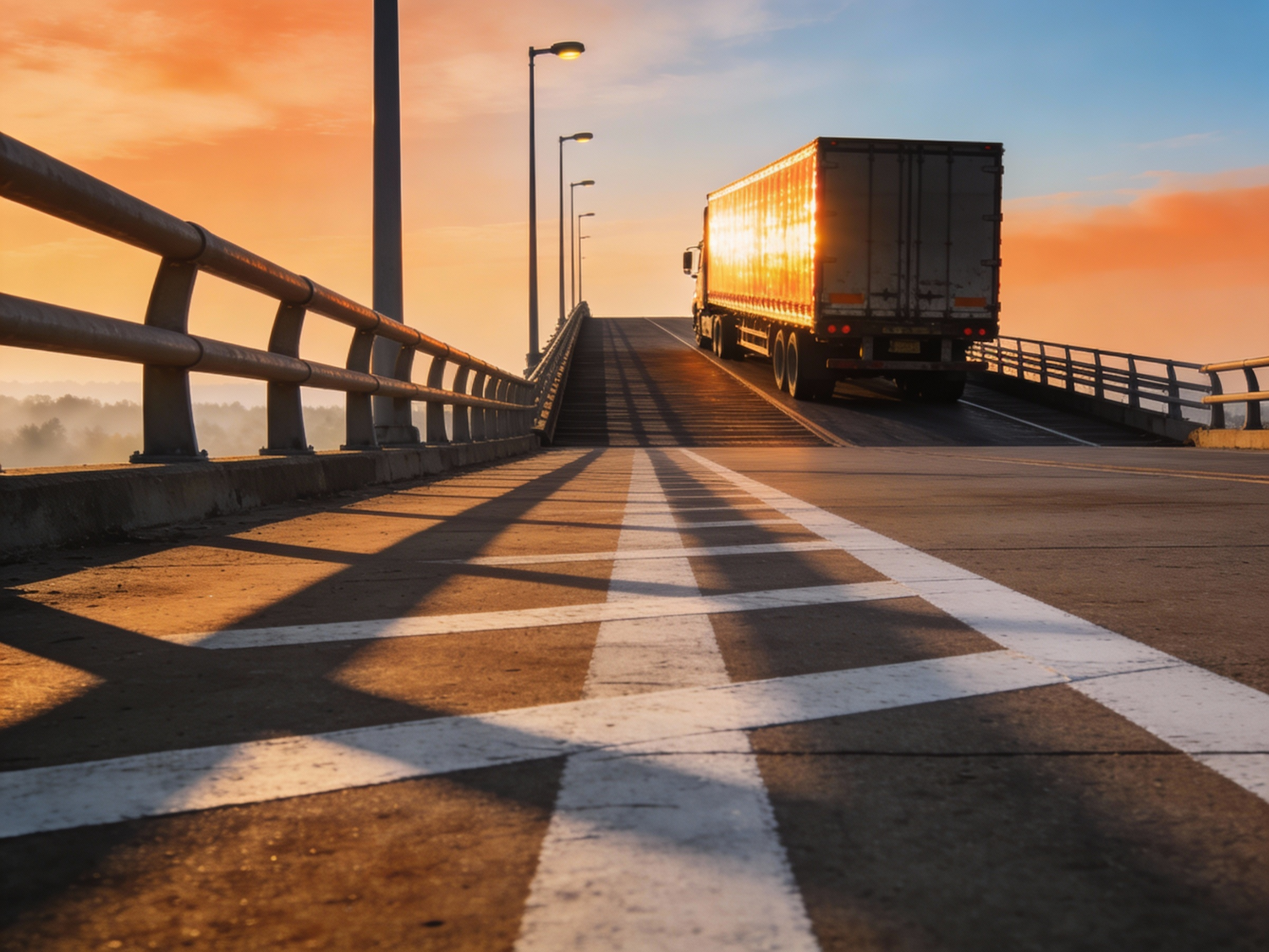 Approach ramp leading up to a freight bridge at golden hour, road rising gently toward the top of the frame; a cargo truck climbs the ramp, rear three-quarter view, trailer edges rimmed with warm light; dry concrete surface with bold lane markings, metal guardrails and lampposts casting long diagonal shadows; distant landscape soft and hazy, sky rich with warm orange and pale blue, ultra sharp, 28 mm.