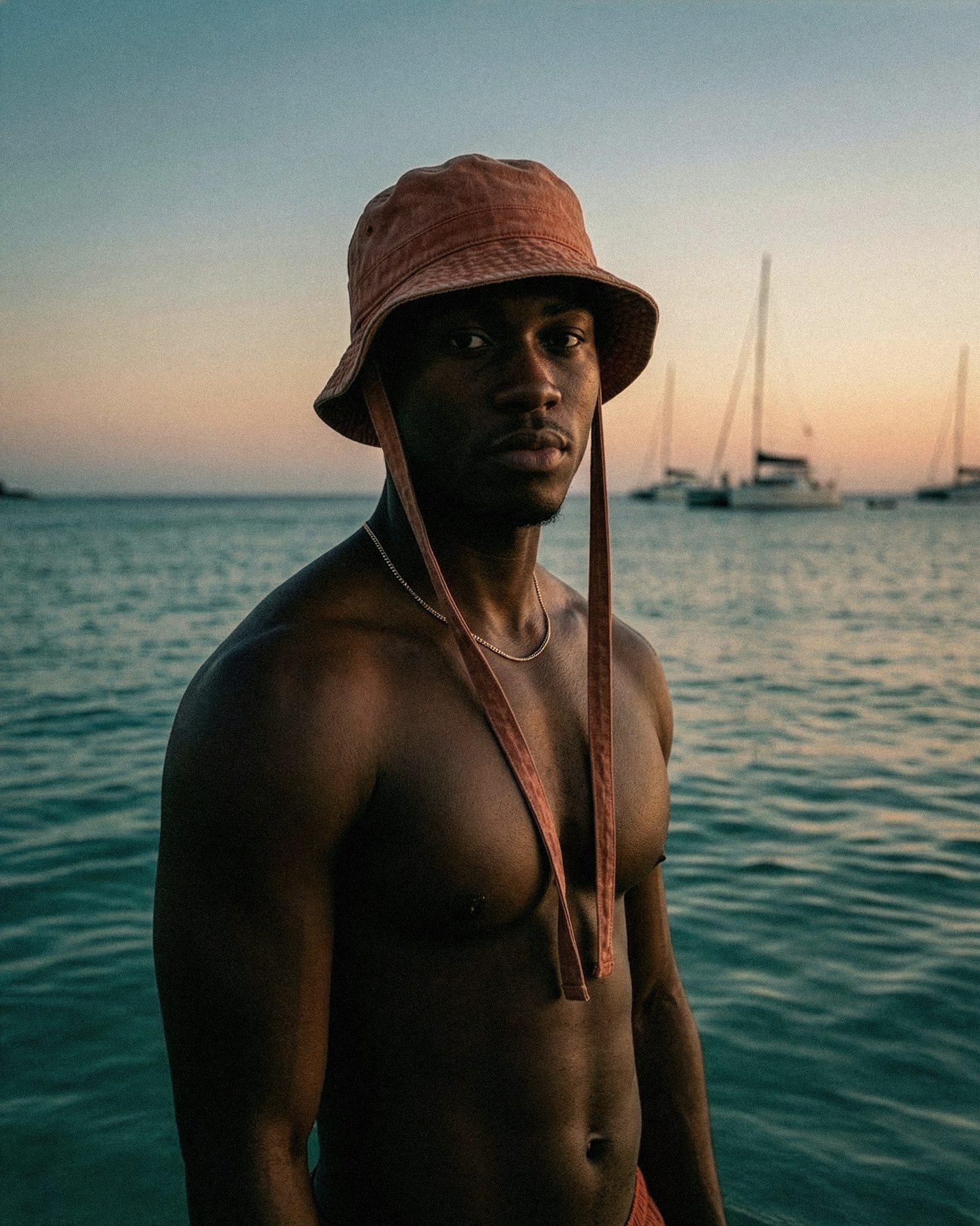 A man in a bucket hat by the sea at sunset, with sailboats in the background and a serene, colorful sky.