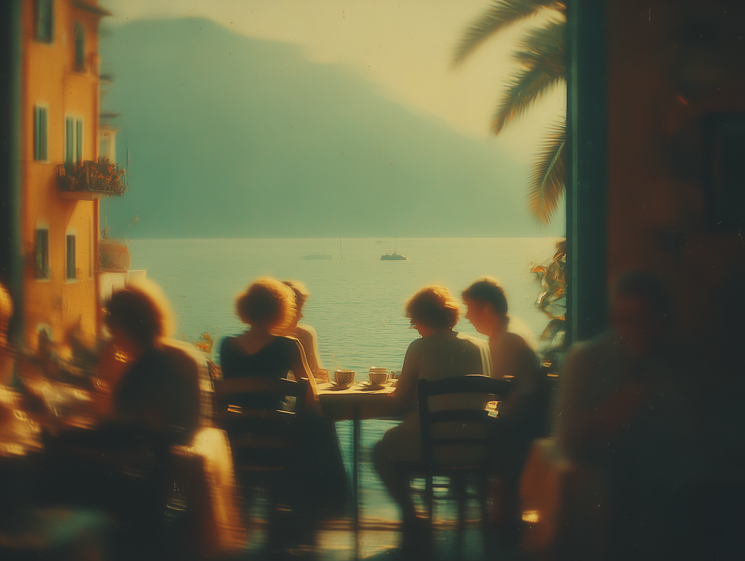 A tranquil café scene with people enjoying a sunset view over a calm sea, surrounded by warm light and a serene atmosphere.