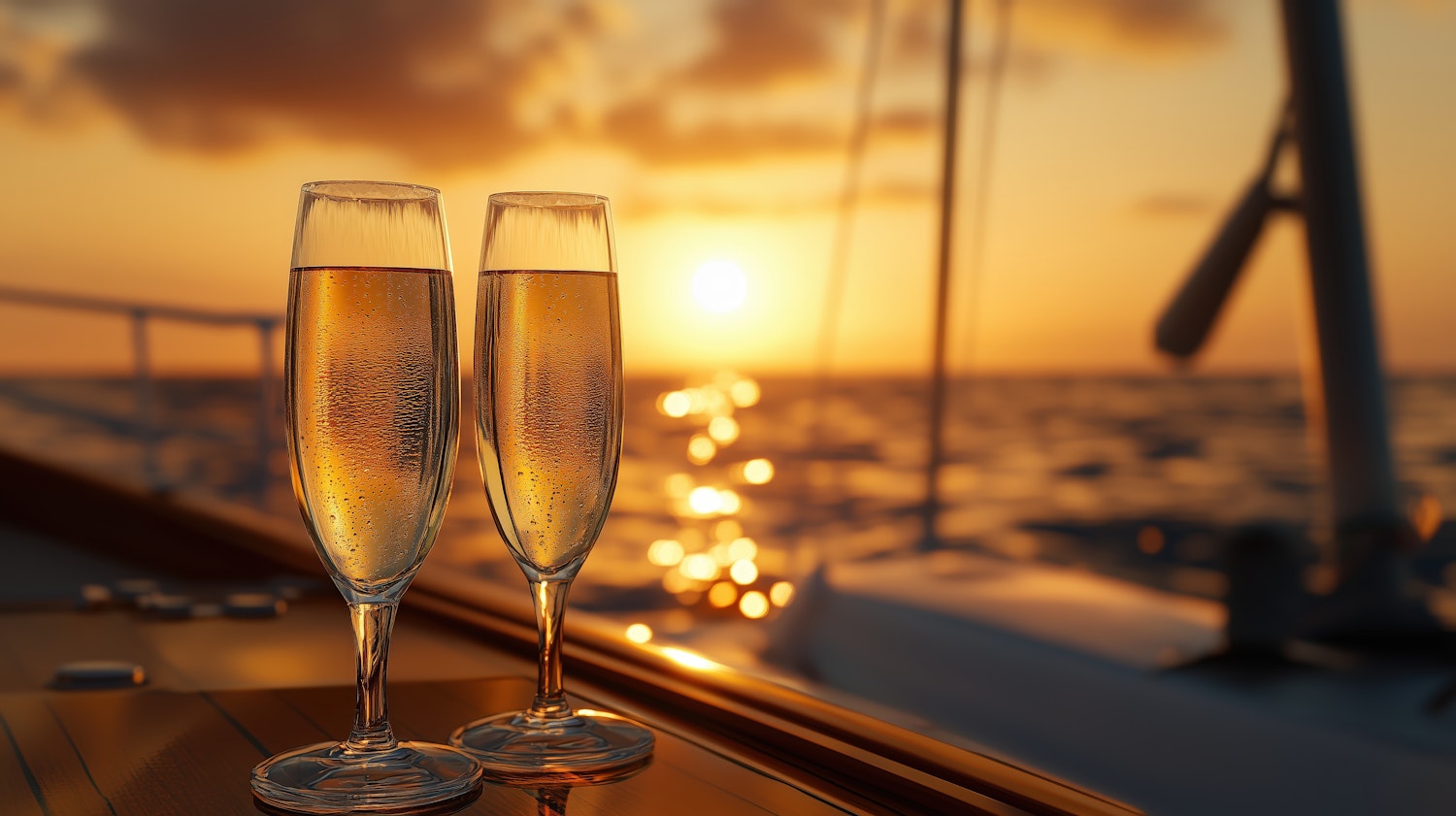 Two champagne flutes on a yacht deck at sunset, with golden light reflecting off the ocean and creating a romantic, serene vibe.
