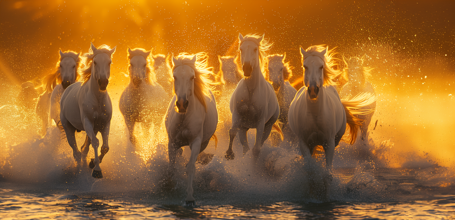Majestic white horses gallop through water at sunset, creating a stunning scene of motion and golden light.