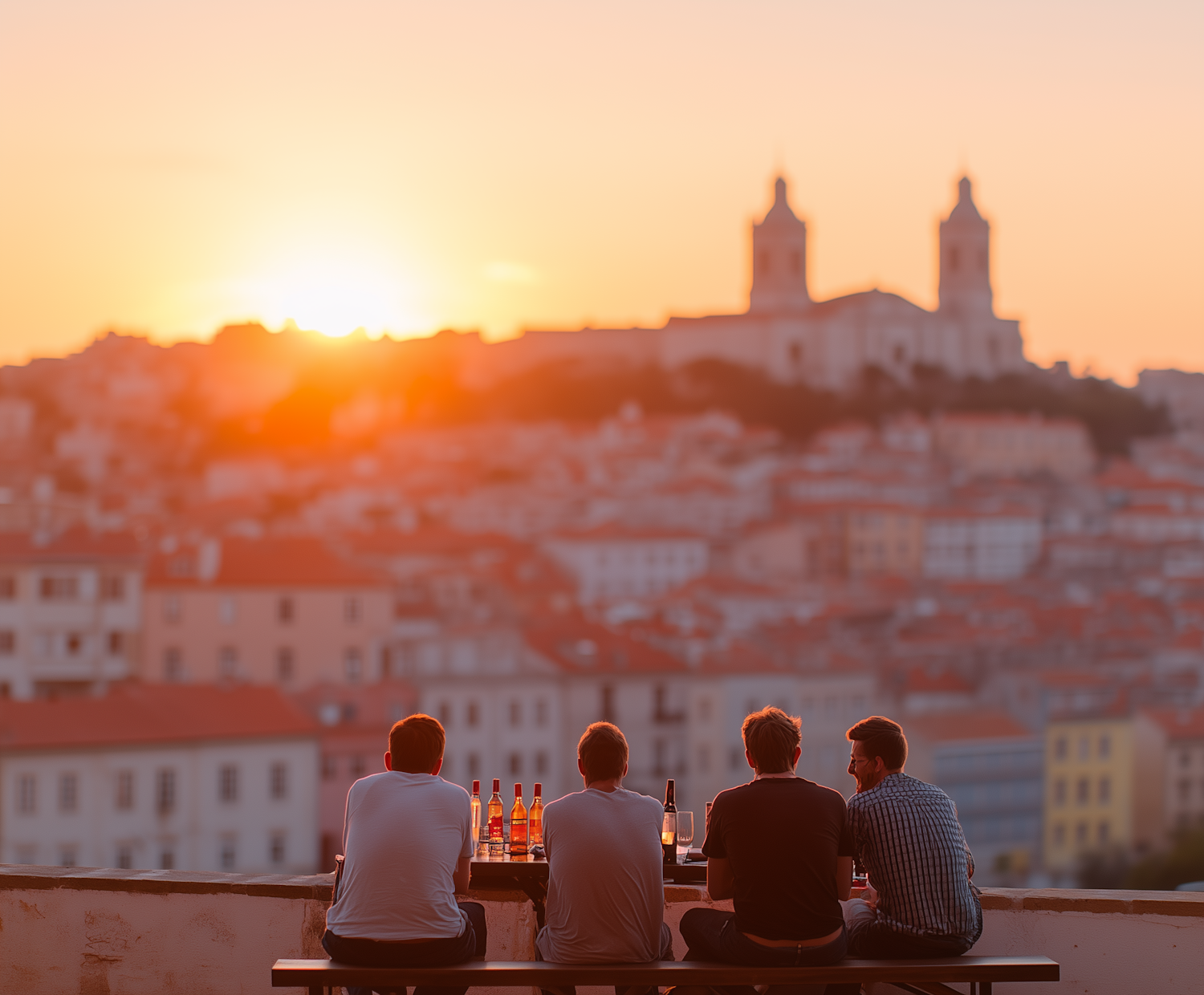 Four friends enjoy drinks at sunset, overlooking a cityscape with a prominent church in the background.