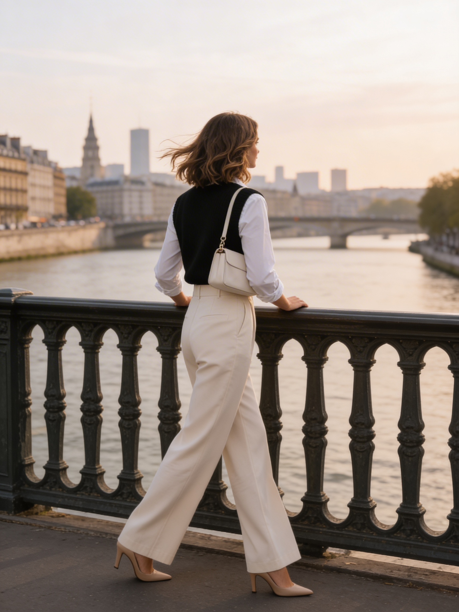 A stylish woman in elegant attire stands on a bridge at sunset, overlooking a serene river and a picturesque cityscape.