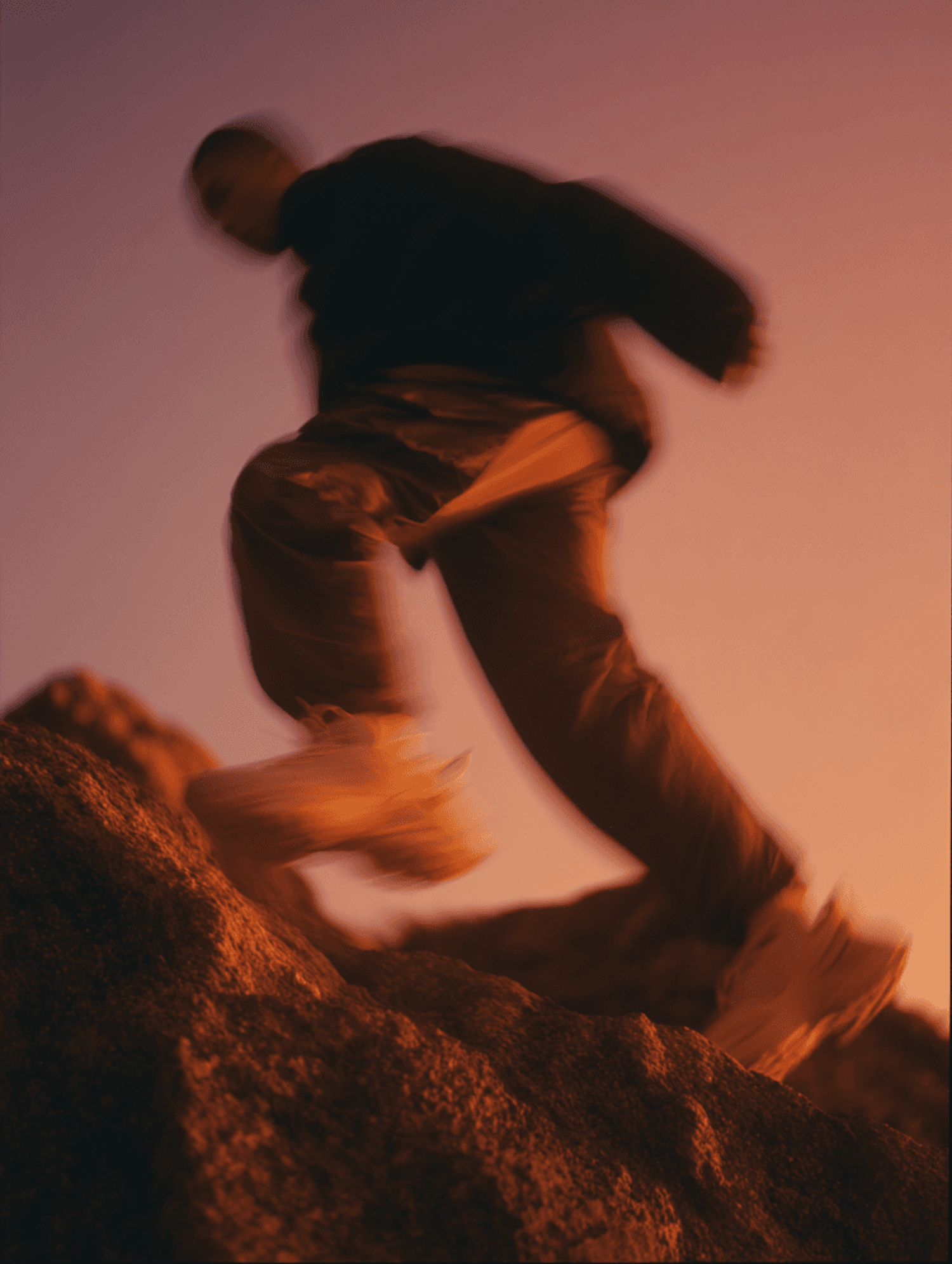 A dynamic shot of a person climbing rocks at sunset, with warm tones and motion blur emphasizing the adventurous atmosphere.