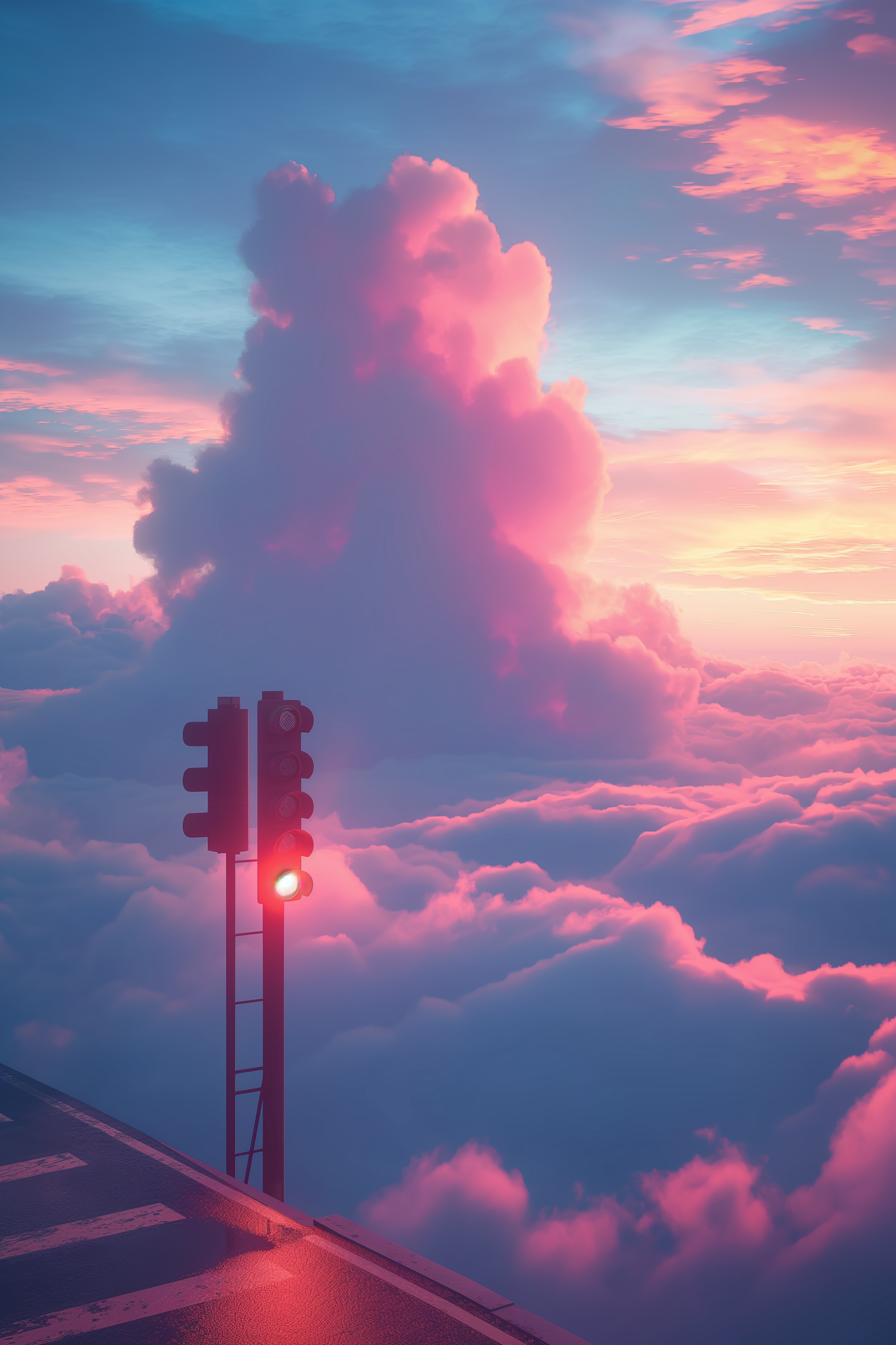 Surreal traffic light glowing red at a road's edge, overlooking vibrant pink and blue clouds under a dreamy sunset sky.