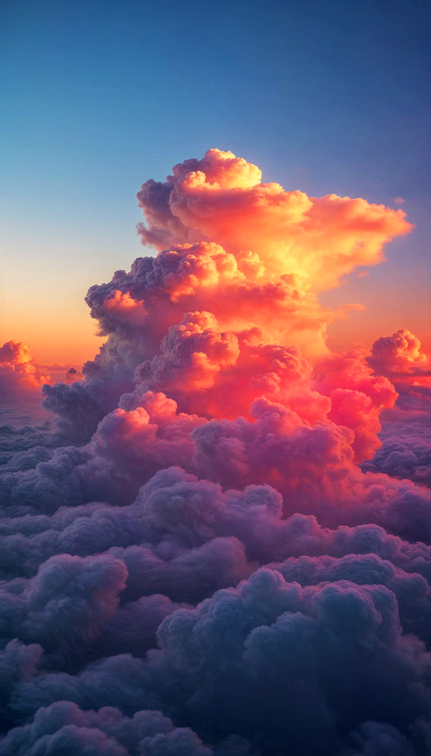 Majestic clouds in vibrant sunset hues, blending purples and oranges against a clear blue sky, creating a serene and dramatic scene.