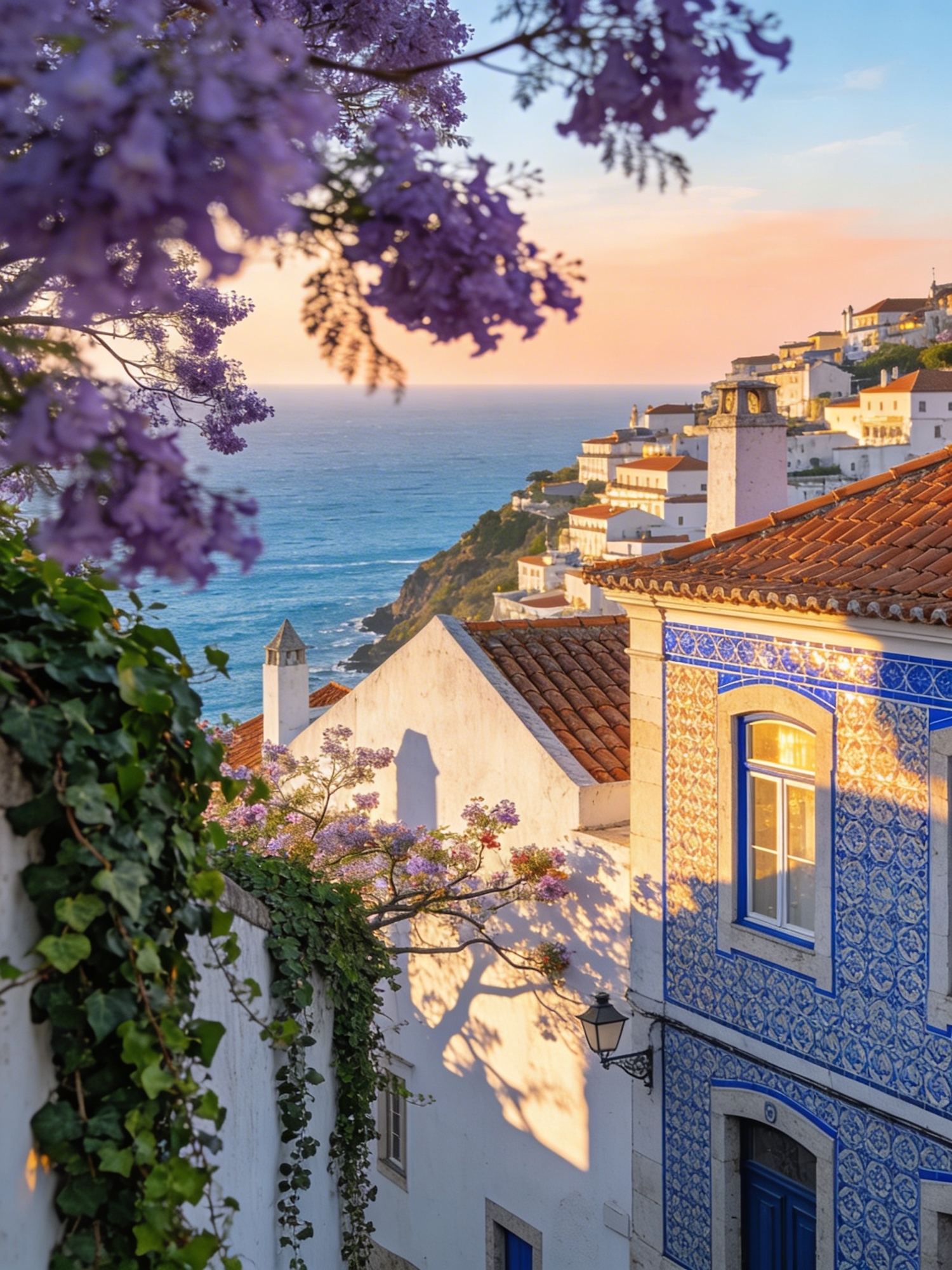 Ultra-realistic high-resolution travel photograph from a slightly elevated perspective, capturing an iconic Portuguese landscape with jacaranda blossoms and climbing ivy in the foreground, whitewashed buildings with terracotta roofs, patterned tiled facades, and a coastal hillside town overlooking the Atlantic Ocean. Warm golden-hour sunlight creates crisp highlights and realistic shadows across ceramic azulejo tiles, stucco walls, and flowering branches. The foreground is framed by softly out-of-focus jacaranda clusters and greenery, leading the eye toward the sunlit architecture on the right and the layered rooftops beyond. In the distance, the ocean glows beneath a pale peach and soft blue sky. The overall palette is luminous and natural, with cobalt tile accents, whitewashed walls, terracotta roofs, lavender-purple blossoms, sea blue, and golden sunlight. Ultra-detailed, photorealistic, sharp textures, realistic depth, natural color grading, editorial travel photography, shot on a full-frame camera, magazine-quality realism, no painting, no illustration, no CGI. Extremely realistic travel photography, crisp fine detail, realistic shadows, true-to-life color, sharp architectural textures, natural optical depth, high-resolution full-frame camera image.