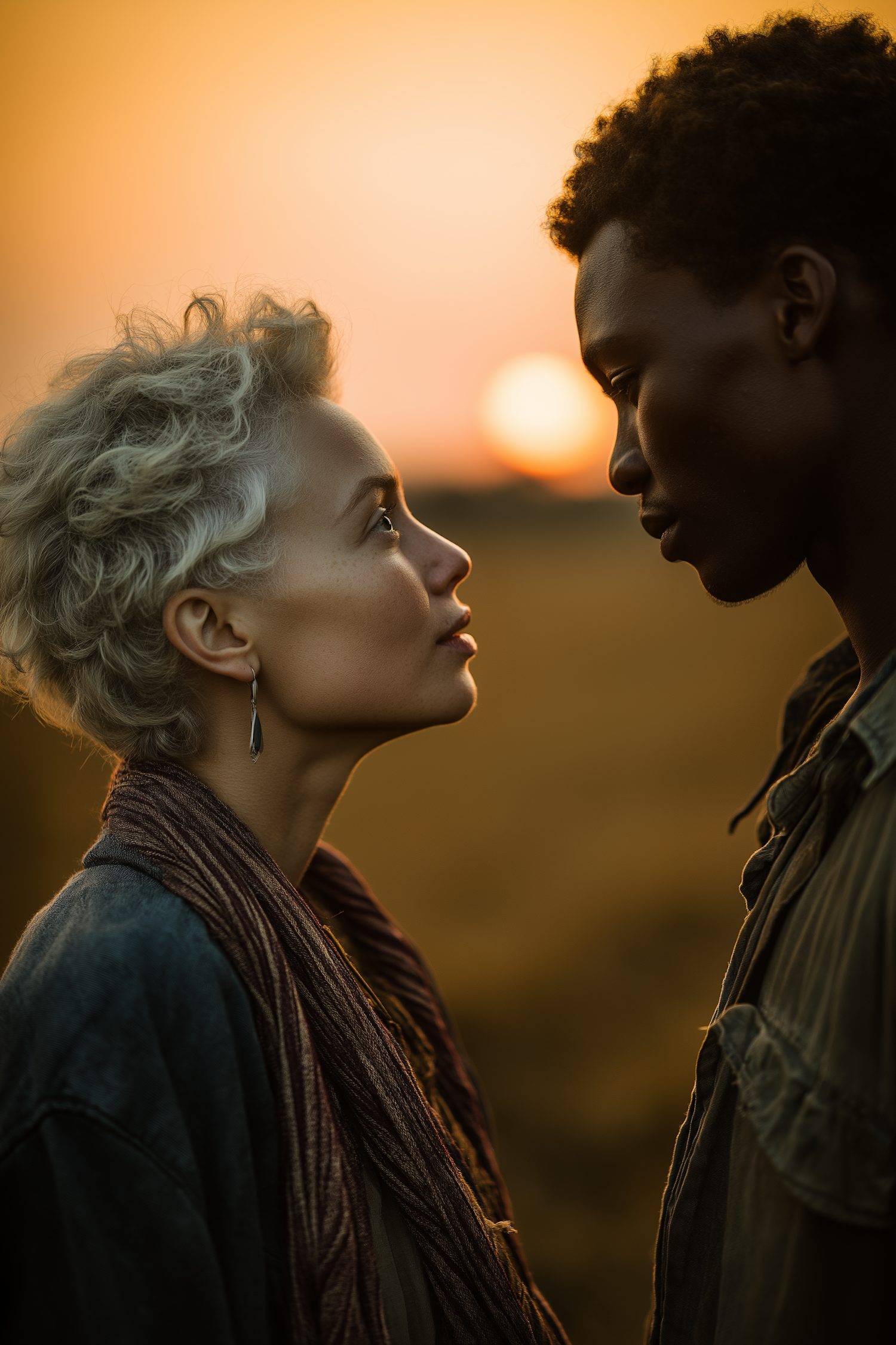 Two individuals share a heartfelt moment at sunset, their profiles illuminated by warm golden light, creating a serene and intimate scene.