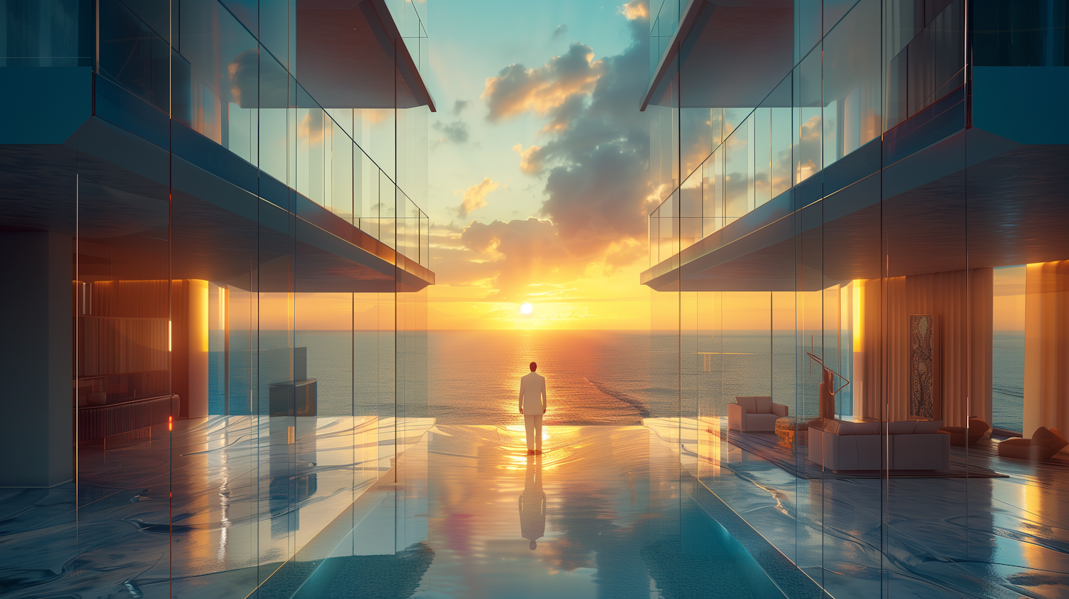 Luxurious modern architecture with glass walls, infinity pool, and ocean view at sunset. A lone figure stands in serene contemplation.