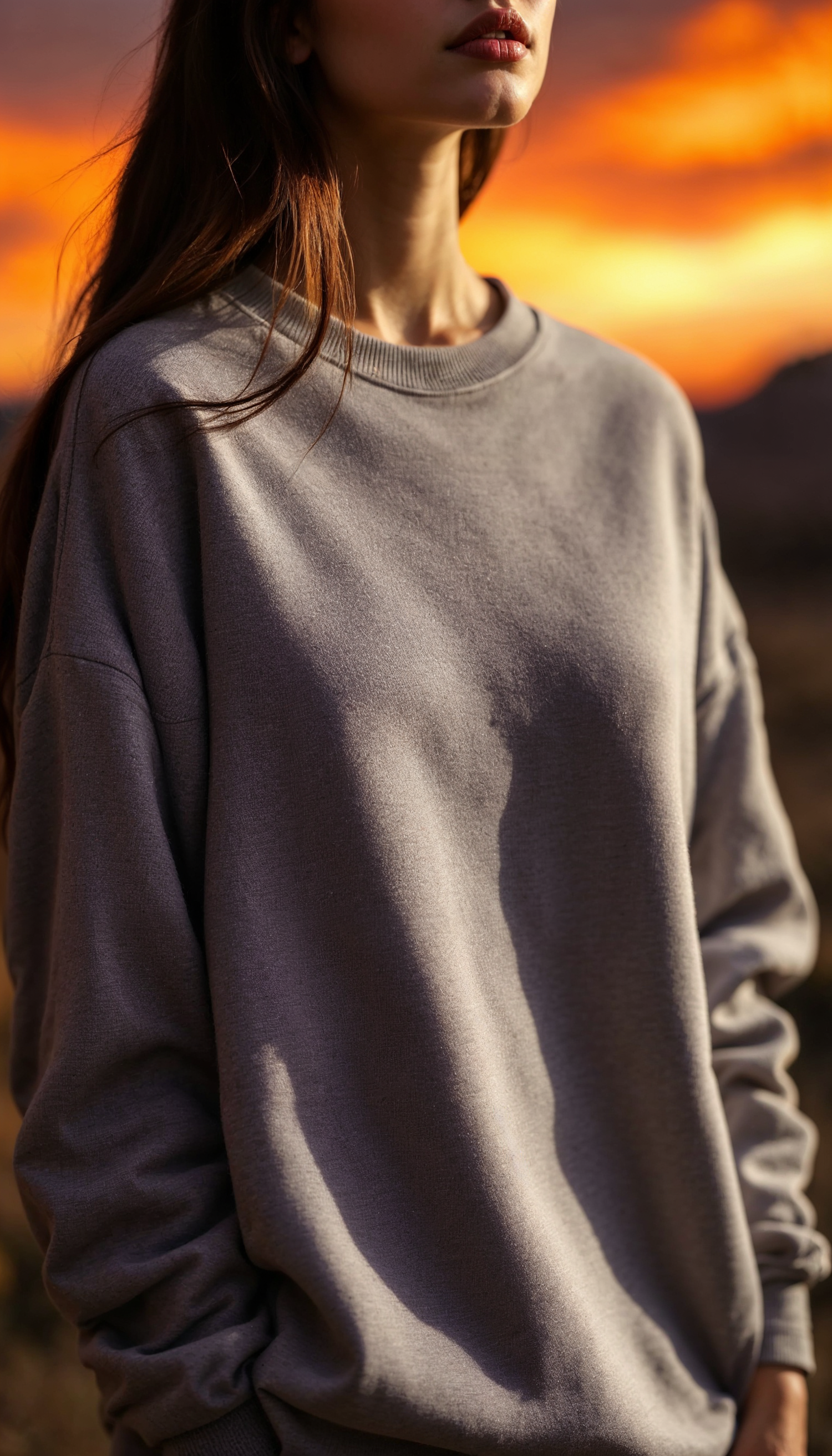 Woman in gray sweatshirt against a vibrant sunset, with long brown hair and contemplative expression.