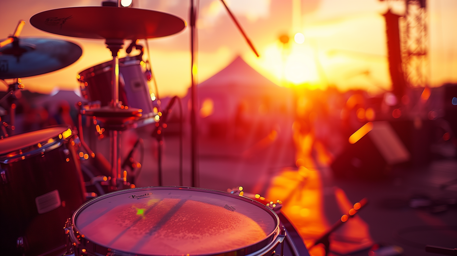Drum set on stage at sunset, with vibrant orange hues and blurred concert background, capturing a lively outdoor music scene.