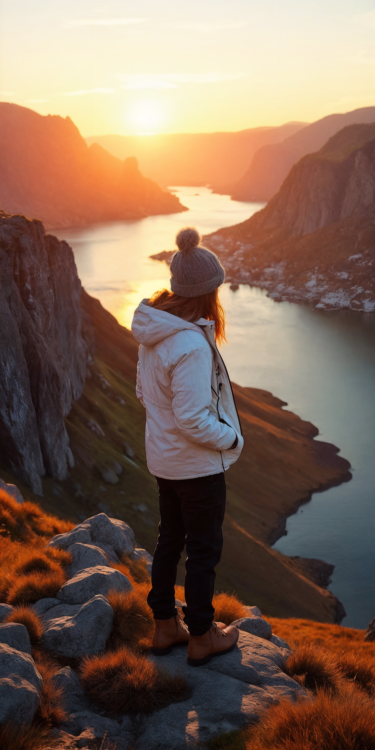 A person in a white jacket and gray hat stands on a cliff, overlooking a fjord at sunset, surrounded by rugged cliffs and golden grass.
