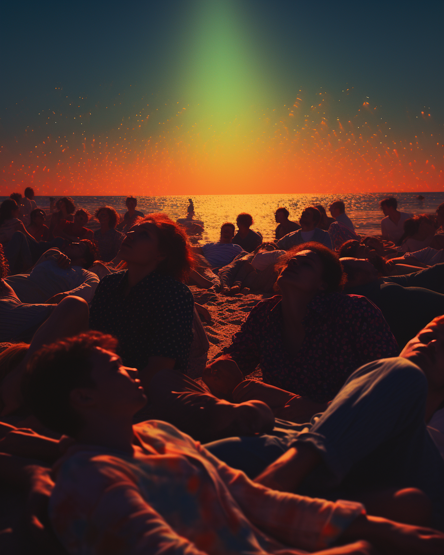 People relax on a beach at sunset, gazing at a mystical green light beam in the sky, creating a serene and magical atmosphere.