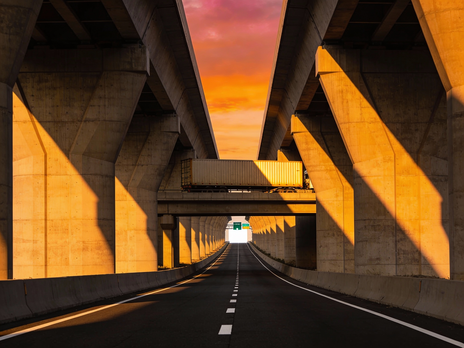 View from beneath a modern highway overpass at golden hour, warm sunlight wrapping around the concrete pillars; a single cargo truck crosses above, side of the trailer catching the light; dry asphalt under the bridge, lane markings leading out toward the bright exit; strong geometric shadows from beams and railings, sky visible in warm tones beyond the structure, ultra sharp, 28 mm.