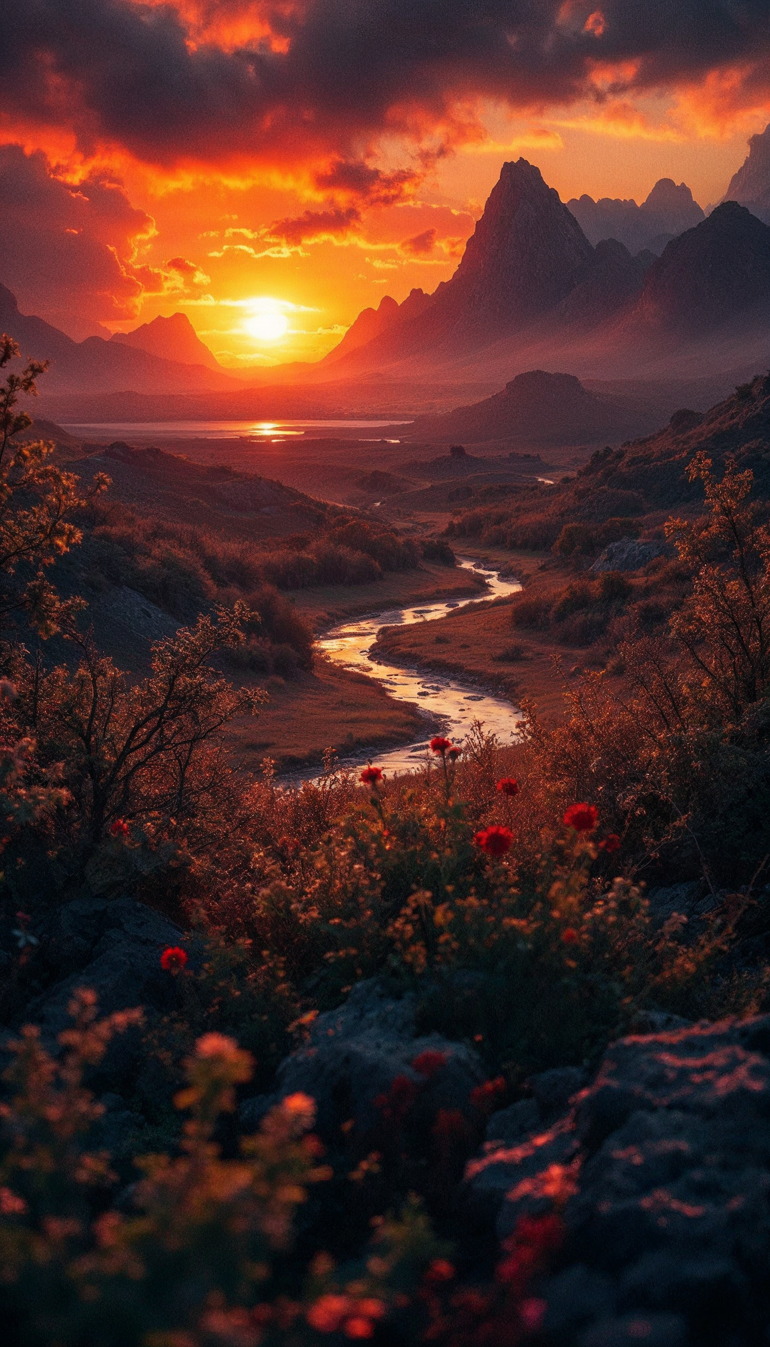 Stunning sunset over jagged mountains with a winding river and vibrant wildflowers, creating a serene and colorful landscape.