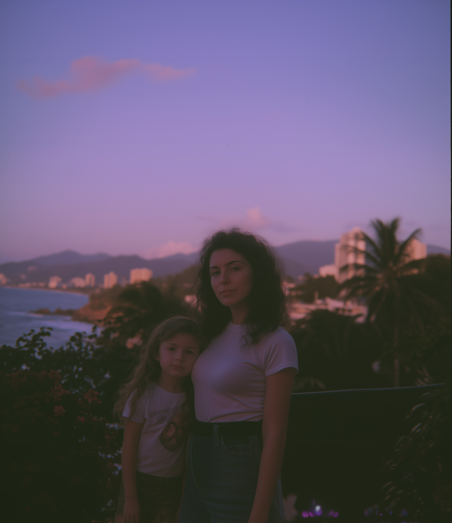 A woman and young girl stand together at sunset with a coastal cityscape and mountains in the background, bathed in soft purple hues.