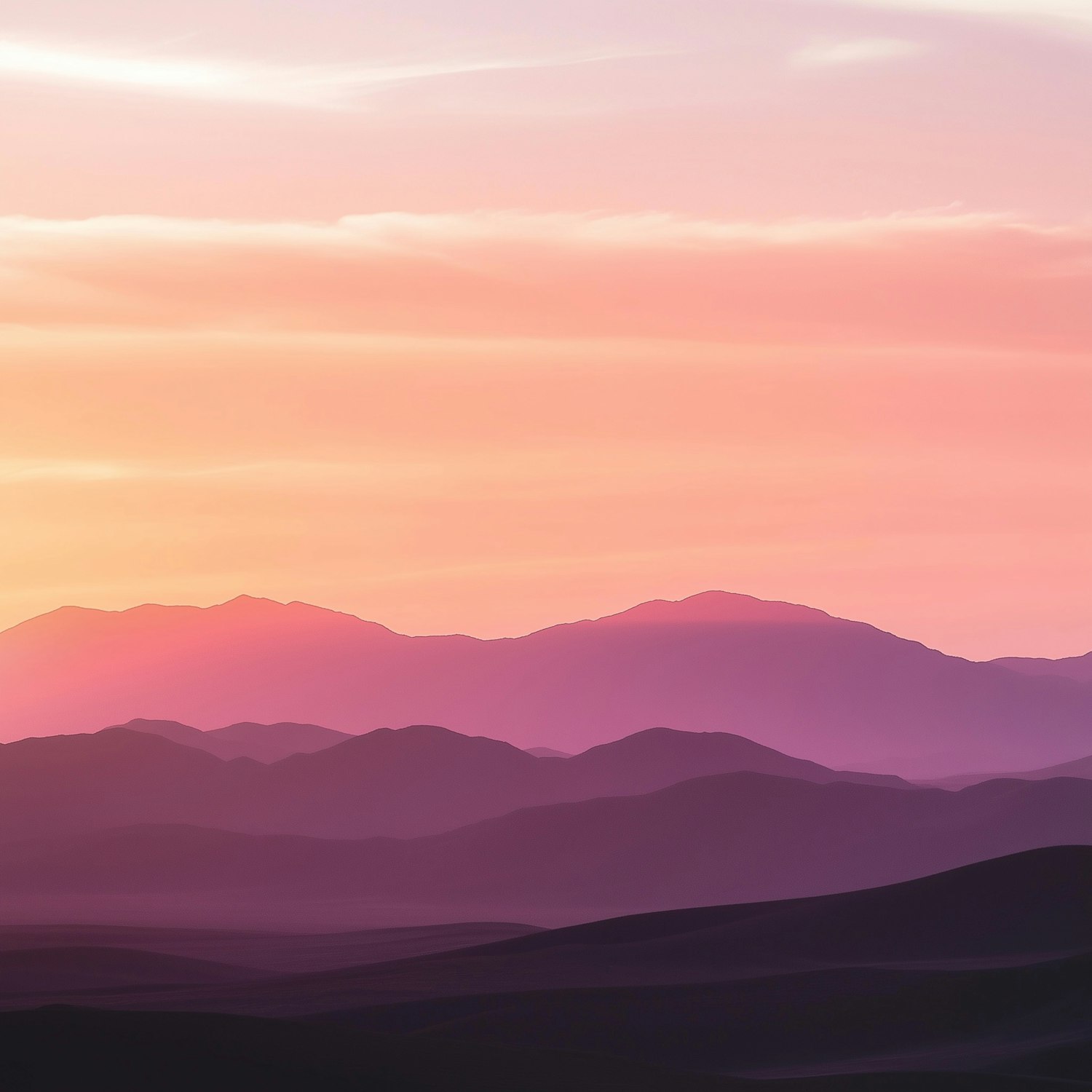 Dreamy sunset over layered mountains in soft pink, purple, and orange hues, creating a tranquil and serene landscape.