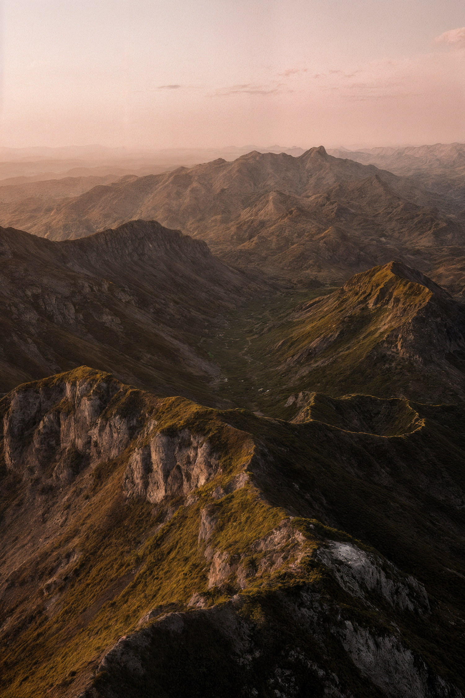 Golden hour over a rugged mountain range, with dramatic peaks and valleys bathed in warm light and a hazy, serene horizon.