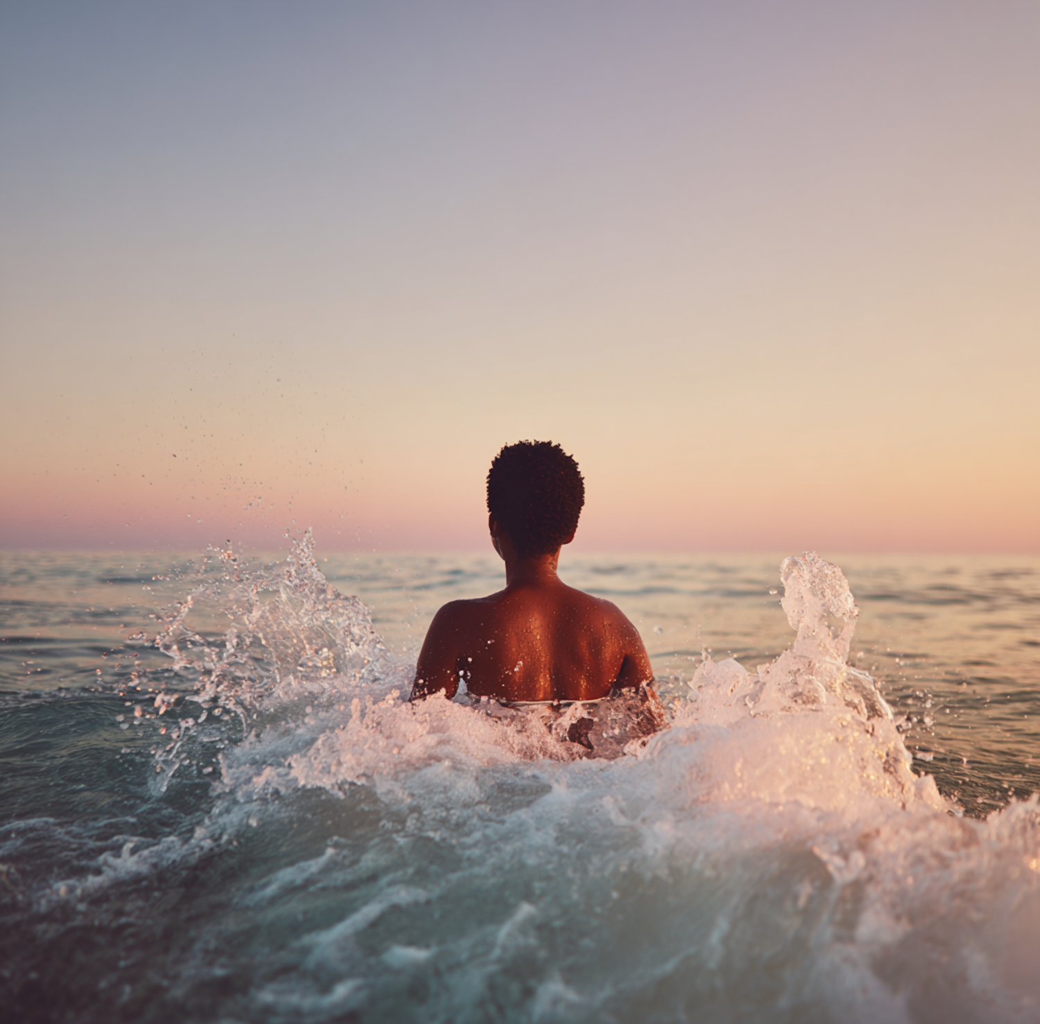 A serene sunset scene with a person standing in the ocean, waves splashing around them, and the sky painted in soft pink and orange hues.
