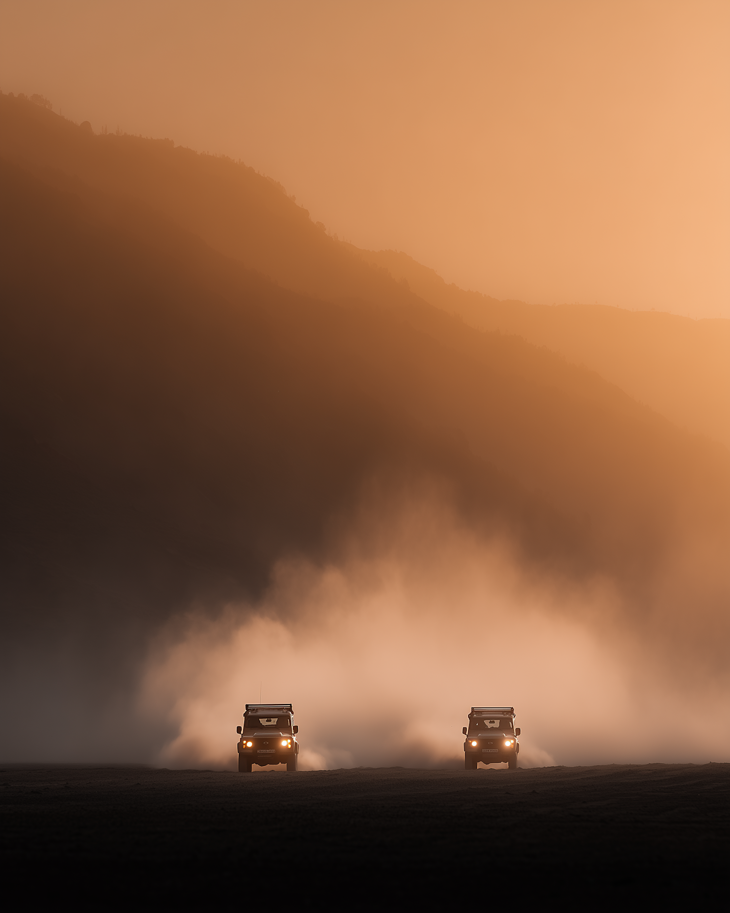 Two off-road vehicles drive through a dusty plain at sunset, their headlights cutting through the haze, with hills silhouetted in the background.