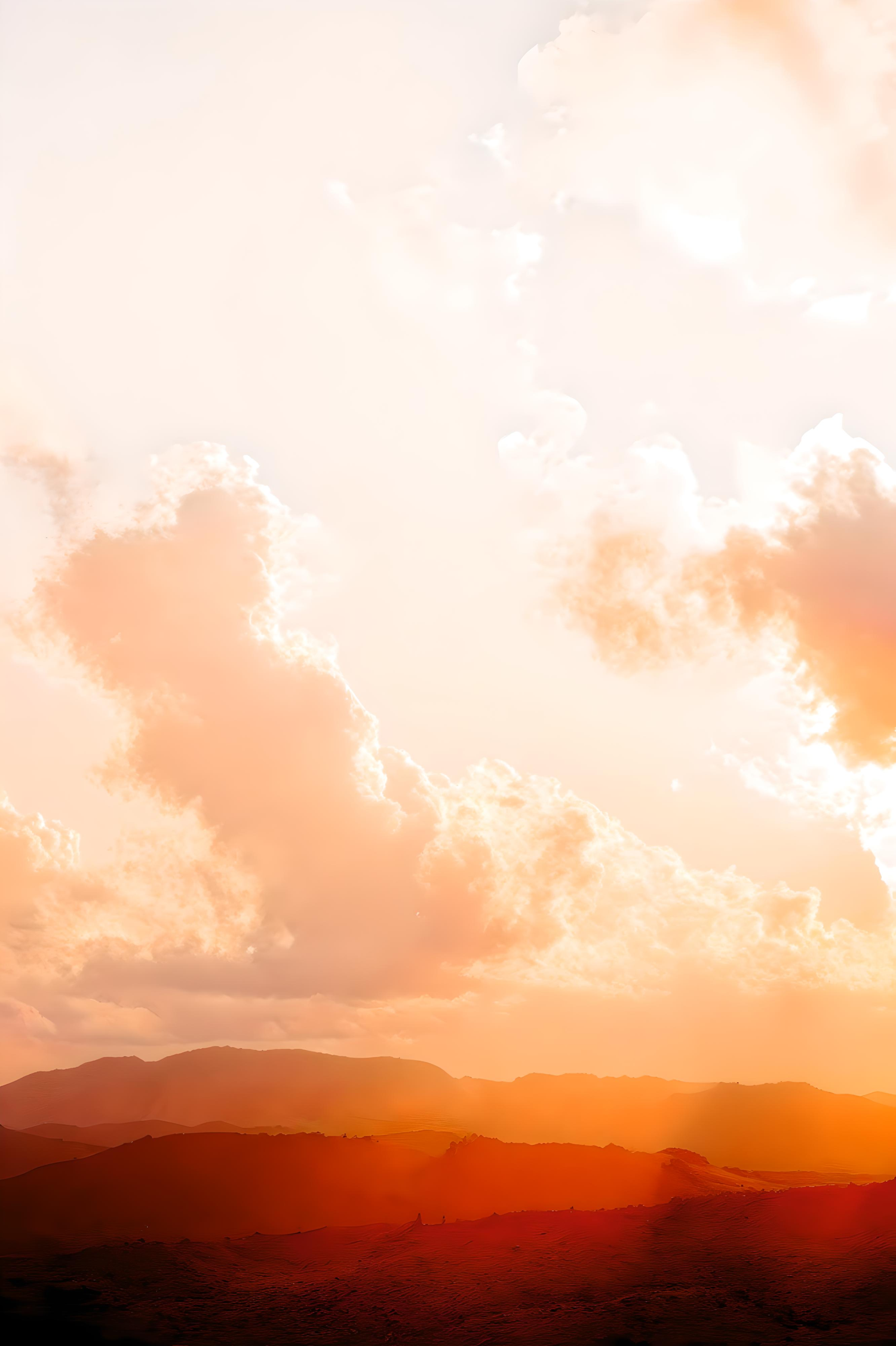 A stunning sunset with golden clouds over rolling hills and reddish terrain, creating a serene and warm natural landscape.