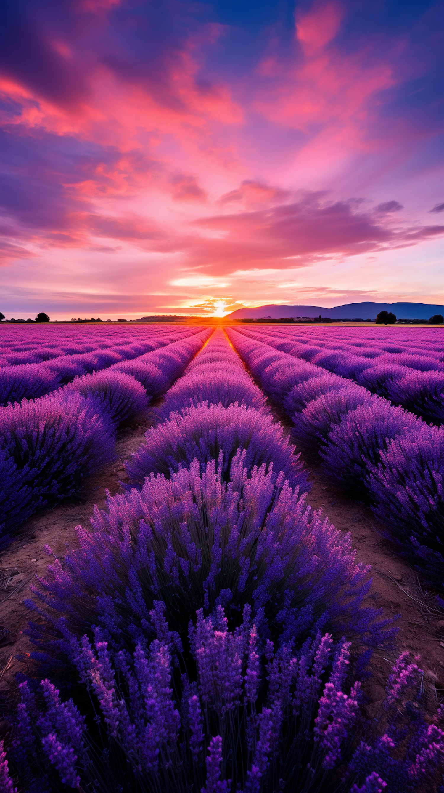 Stunning lavender field at sunset with vibrant purple flowers and a colorful sky, creating a serene and enchanting landscape.