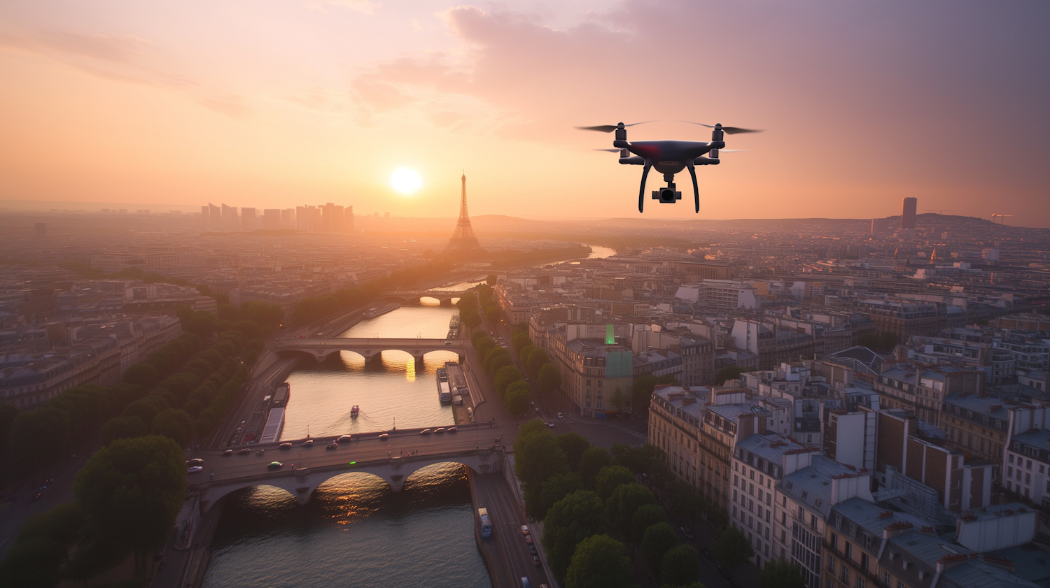 Drone flying over Paris at sunset with Eiffel Tower in the background, capturing the city's beauty and vibrant colors.