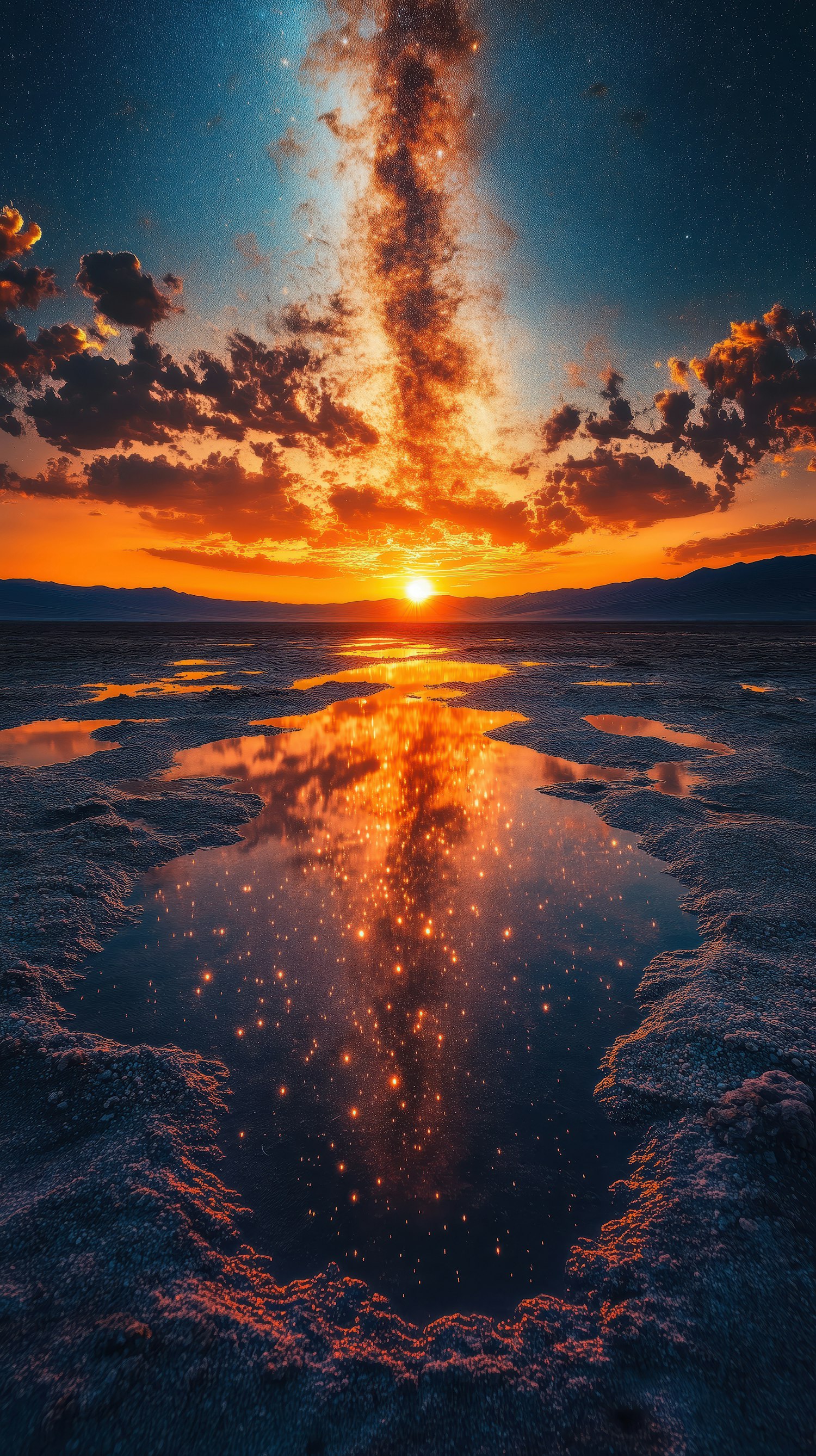 Stunning sunset over a reflective water surface, with vibrant colors and a serene, otherworldly atmosphere.
