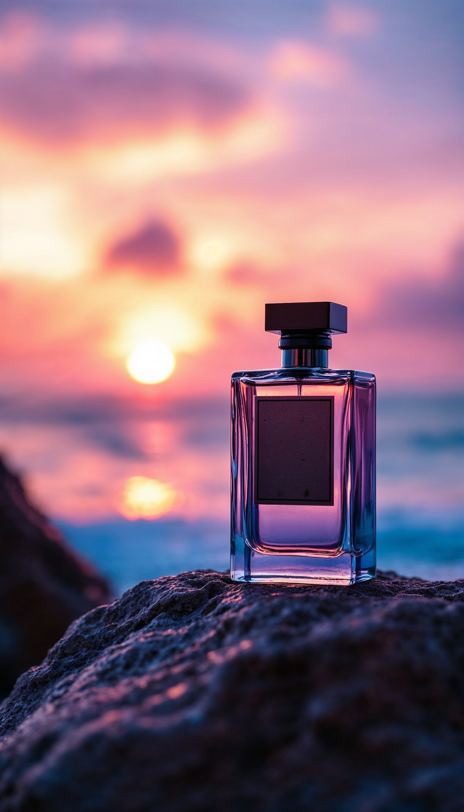 Elegant perfume bottle on rocks with a stunning sunset backdrop, blending pink, purple, and orange hues over a calm ocean.