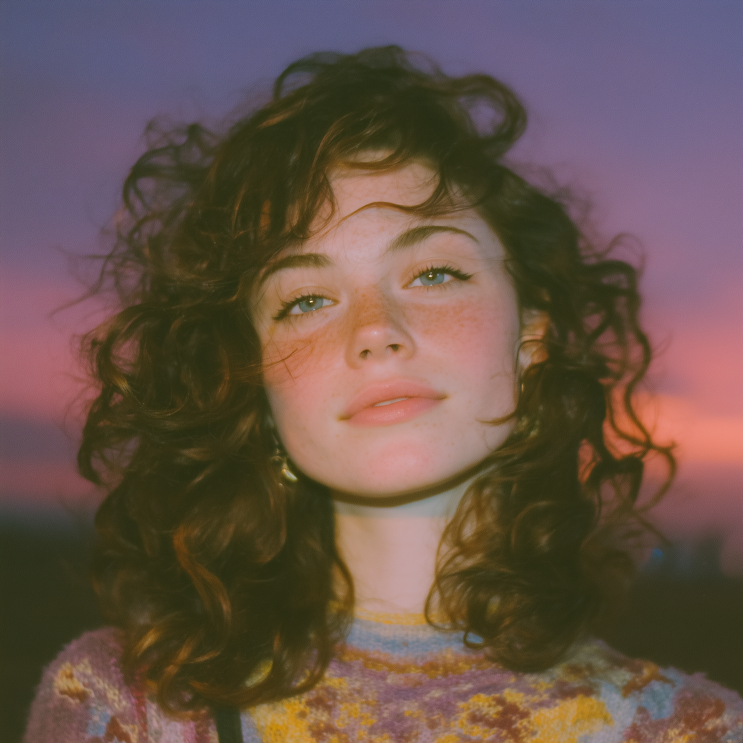 Close-up portrait of a young woman with curly auburn hair and green eyes, set against a vibrant sunset sky.