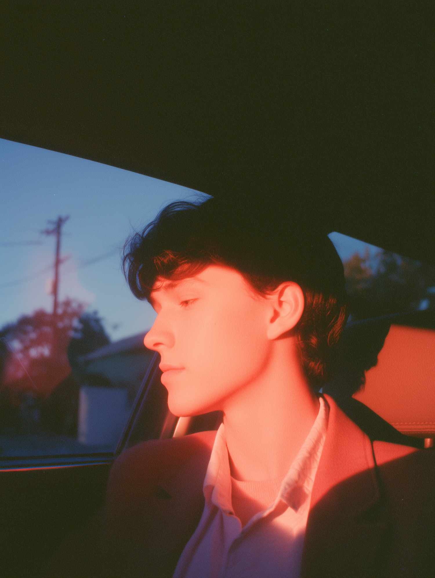 A serene moment captured in a car during sunset, with warm light highlighting the subject's profile and a twilight sky in the background.